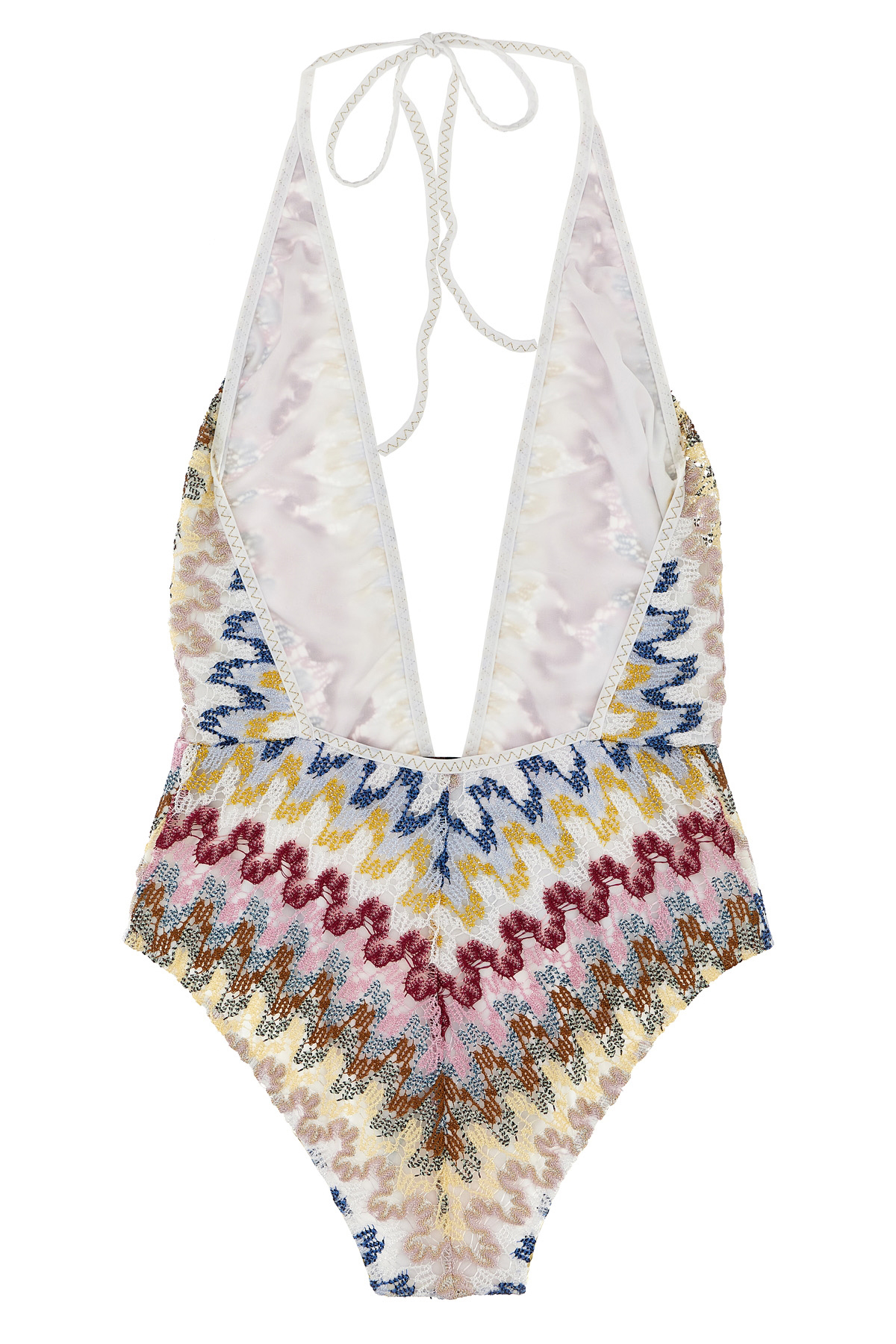 One-piece swimsuit in viscose lace lame with crochet 'Zig-Zag' pattern, deep V-neck, lacing closure on the neck, classic briefs.