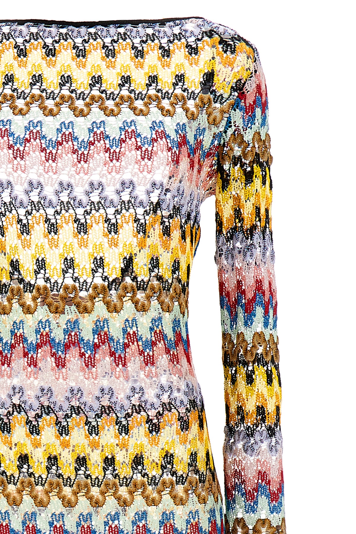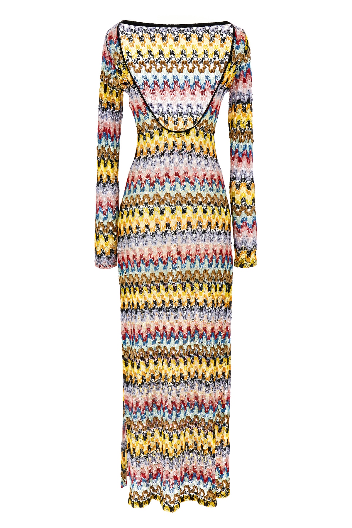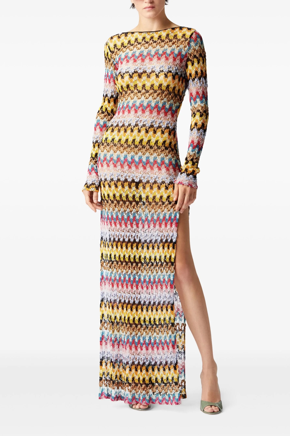 Viscose blend knit dress with wave pattern and lame details, front boat neckline, deep round neckline at the back, long sleeves, side slits.