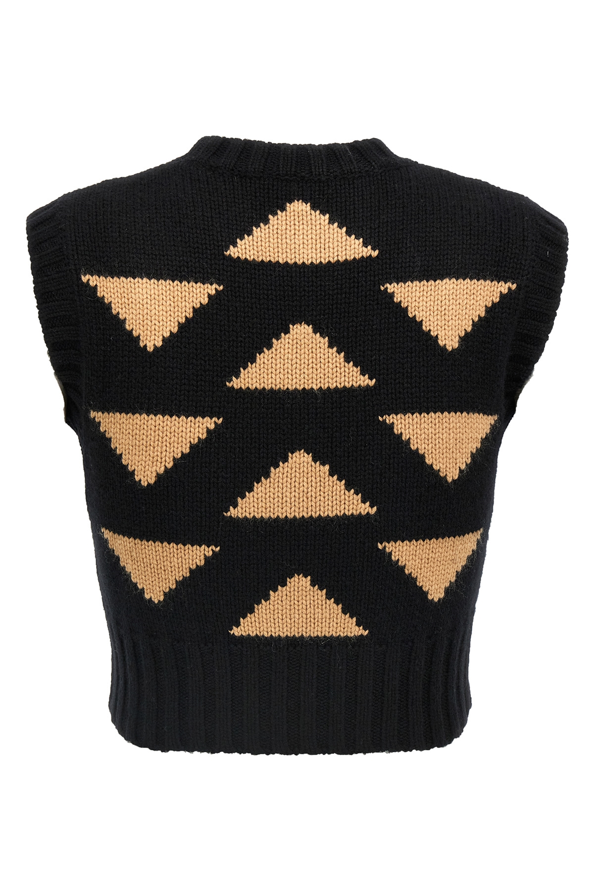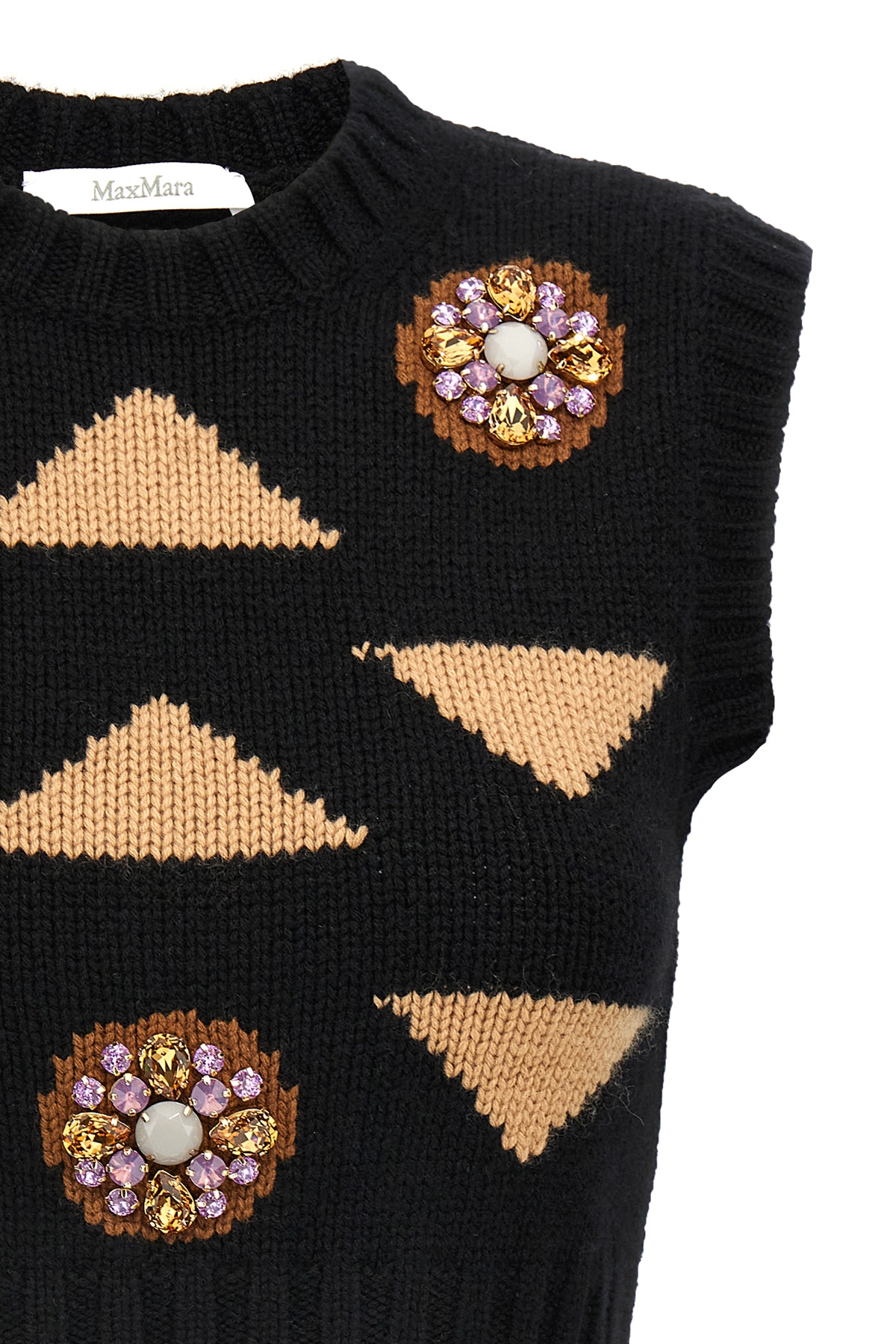 'Baby' waistcoat in wool and cashmere yarn worked in shaved stitch with contrasting inlaid pattern and front stone and crystal decoration, crop model, crew neck.