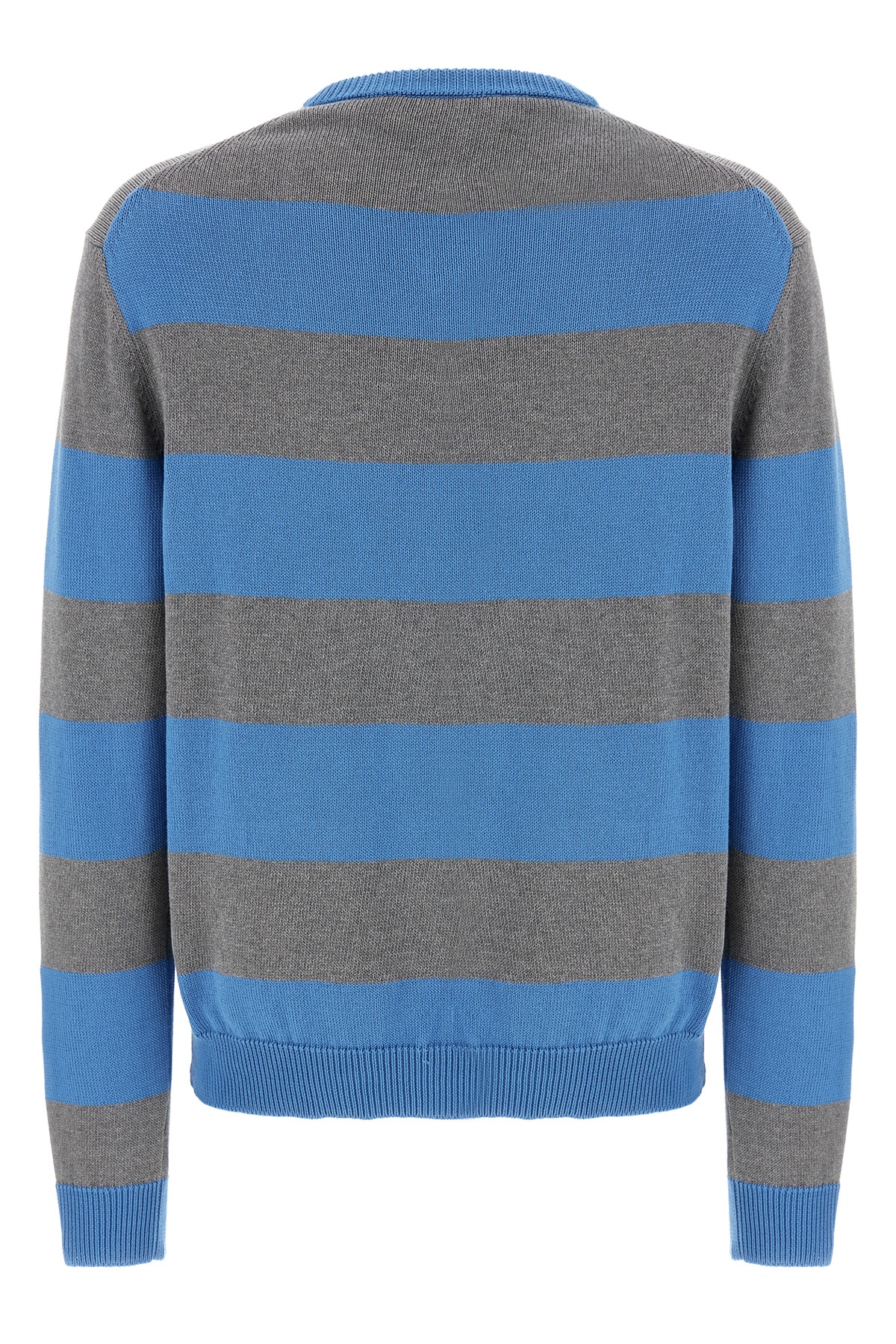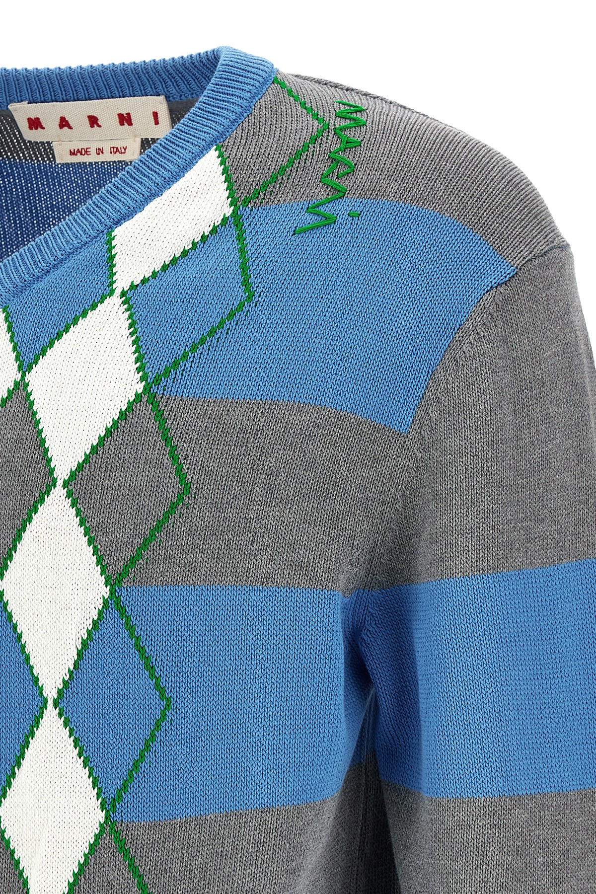 Striped cotton sweater with contrast inlaid 'Argyle' pattern on the front, Marni Symbol embroidery on the shoulder, V-neck, long cuffed sleeves.