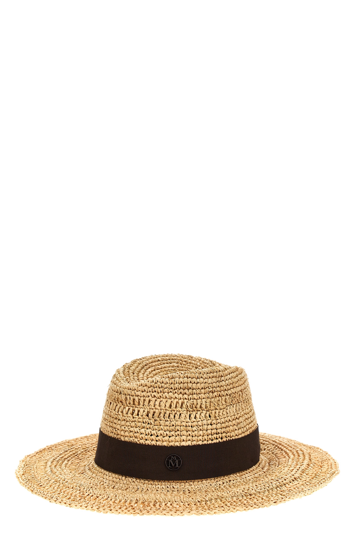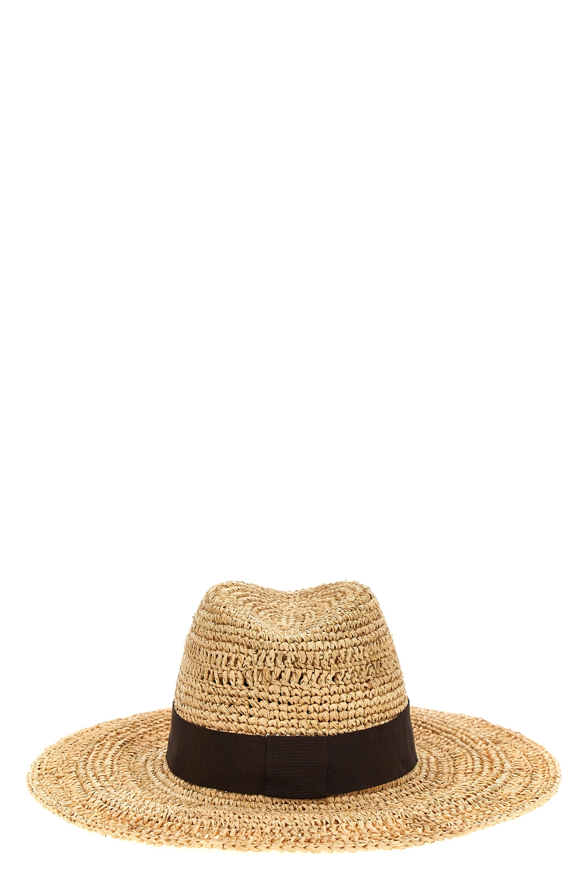 'Kate' hat in crocheted raffia straw, fedora model, grosgrain ribbon and contrast metal logo, removable metal charms.