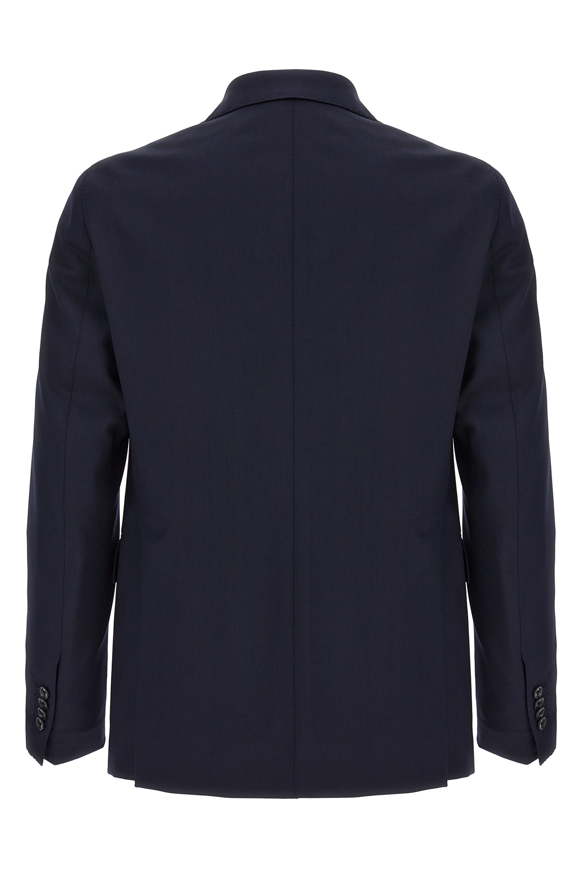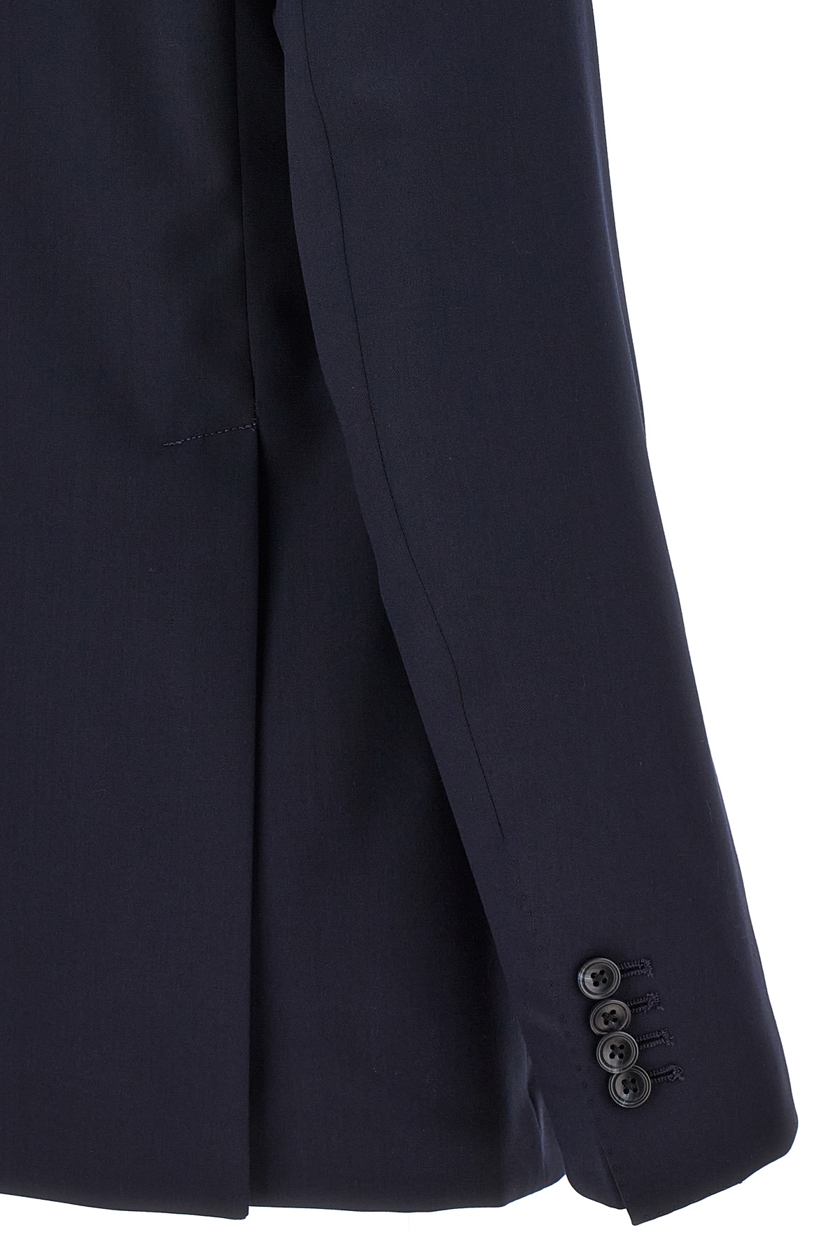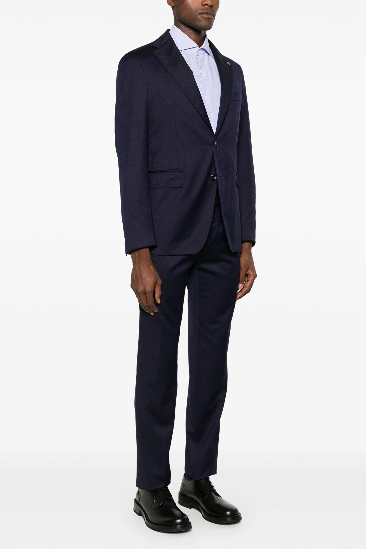 'Vesuvio' super 110's wool dress consisting of single-breasted blazer with button closure, pockets, long sleeves, back slits, pants with zip and button closure, pockets, pin tucks and ironed pleat.