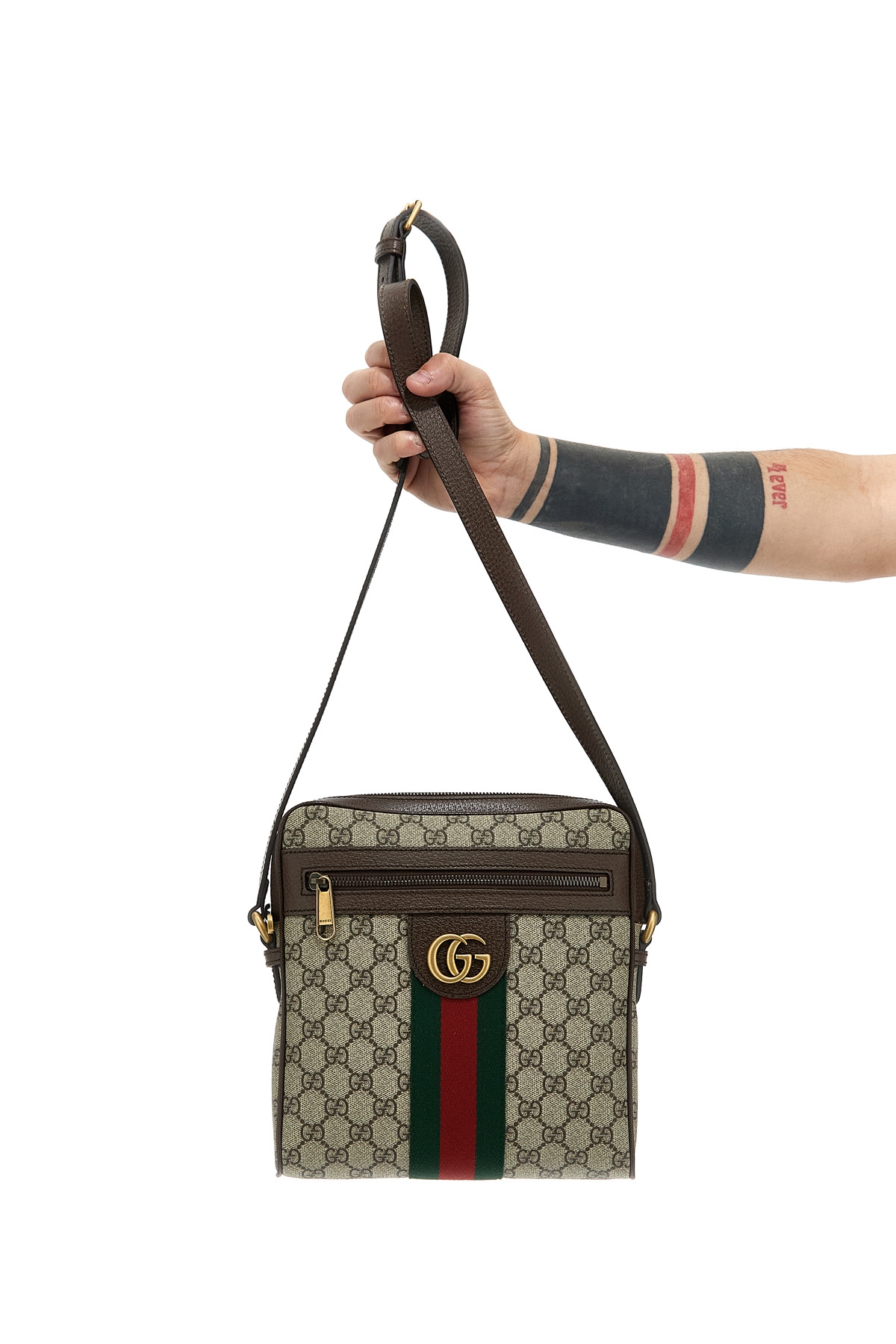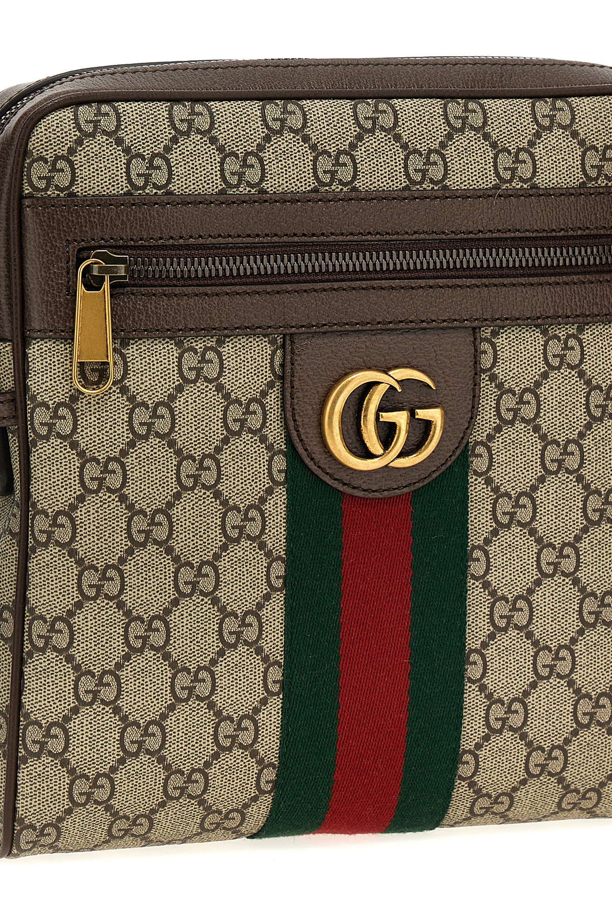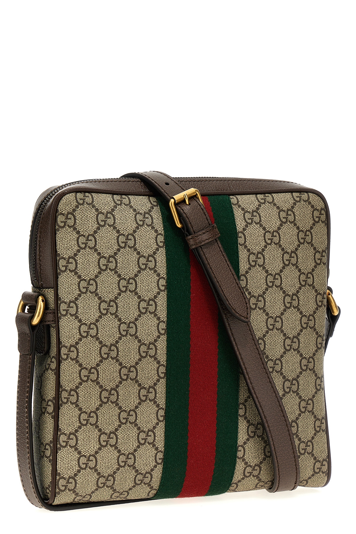 Small 'Ophidia GG' shoulder bag in beige and ebony GG Supreme fabric, material with reduced environmental impact, with brown leather trim, red and green web ribbon, antique gold-colored finishes, open internal pocket. double G. front zip pocket, inside zip pocket, adjustable leather shoulder strap, zip closure, cotton and linen lining. In a mix of the Maison's distinctive codes, such as the GG motif and the Web ribbon, the Ophidia line is enriched with new shapes. A versatile model originally inspired by couriers, postmen and deliverymen, in the 1980s the shoulder bag became a cult accessory on the streetwear scene.