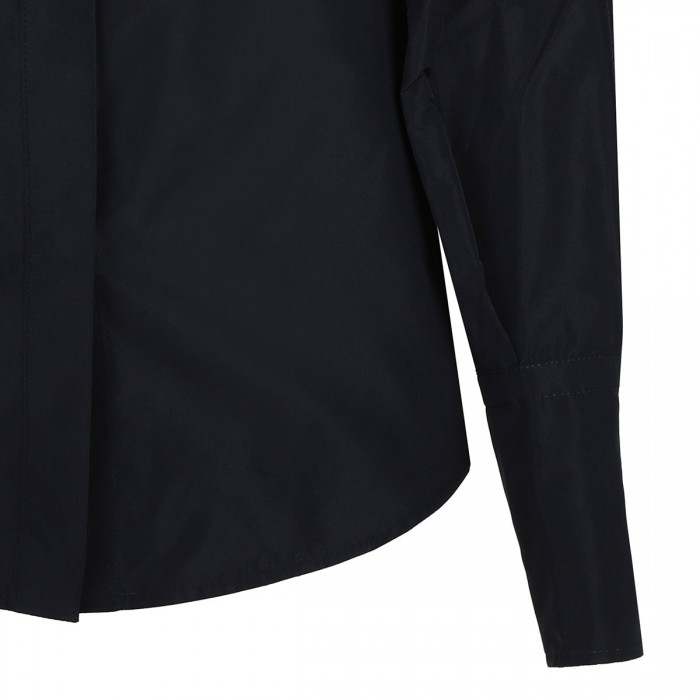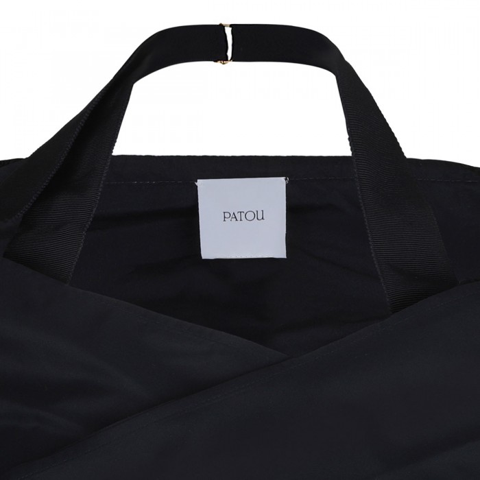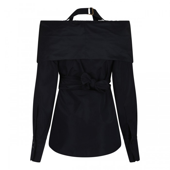Navy blue recycled polyester faille blouse from Patou featuring detachable top layer that wraps around the bust and ties at the back, wide neckline with elastic shoulders, grosgrain halterneck strap., concealed button fastening at front, elongated sleeves with buttoned cuffs.