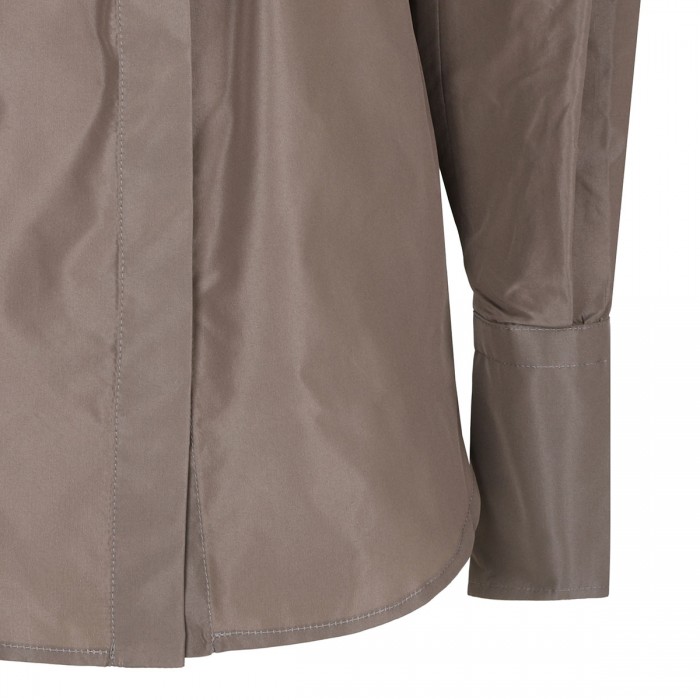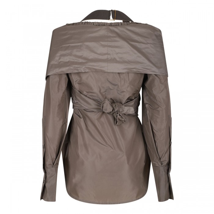 Mocha hue recycled polyester faille blouse from Patou featuring detachable top layer that wraps around the bust and ties at the back, wide neckline with elastic shoulders, grosgrain halterneck strap., concealed button fastening at front, elongated sleeves with buttoned cuffs.