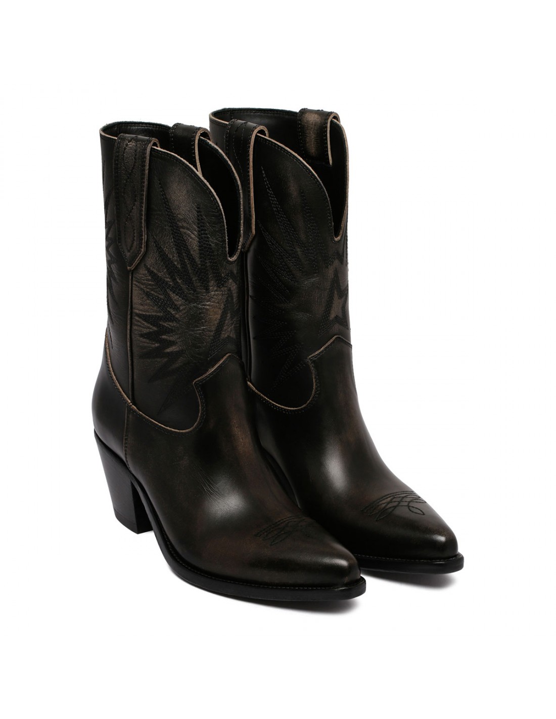 Black leather Wish Star boots from Golden Goose featuring star embroidery, tone-on-tone embroideries on toe, pointed toe, metal plaque engraved with the Golden Goose signature on heel, vintage finish, block heel, leather insole and sole.