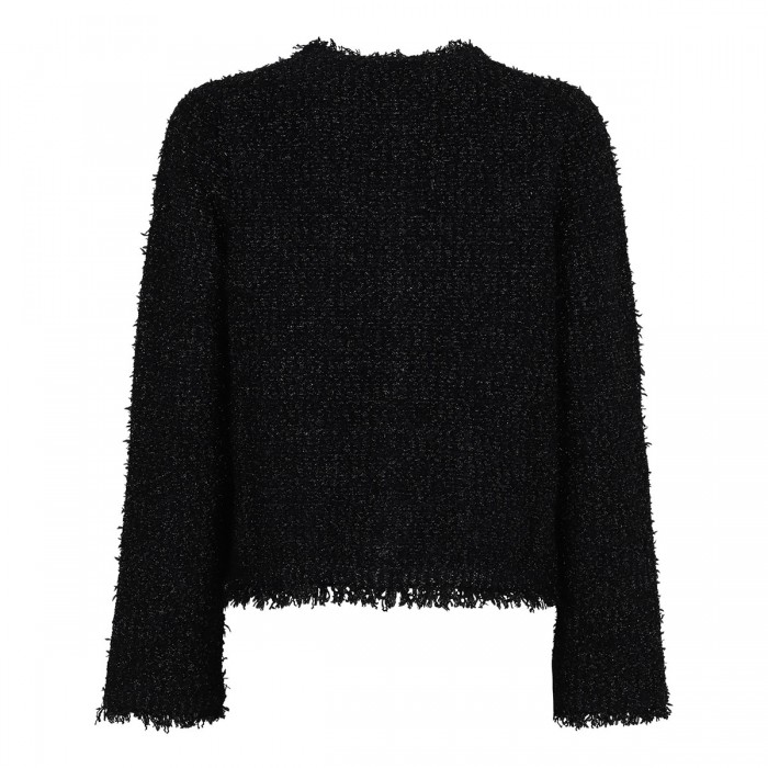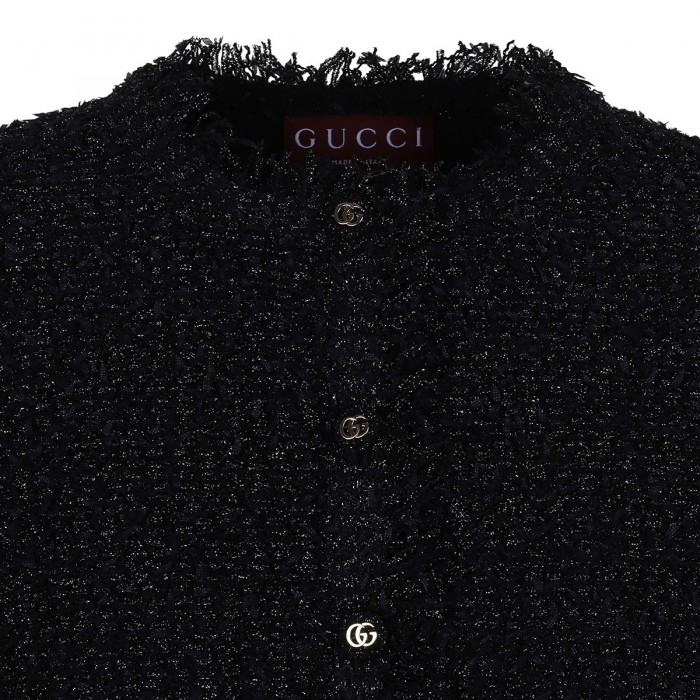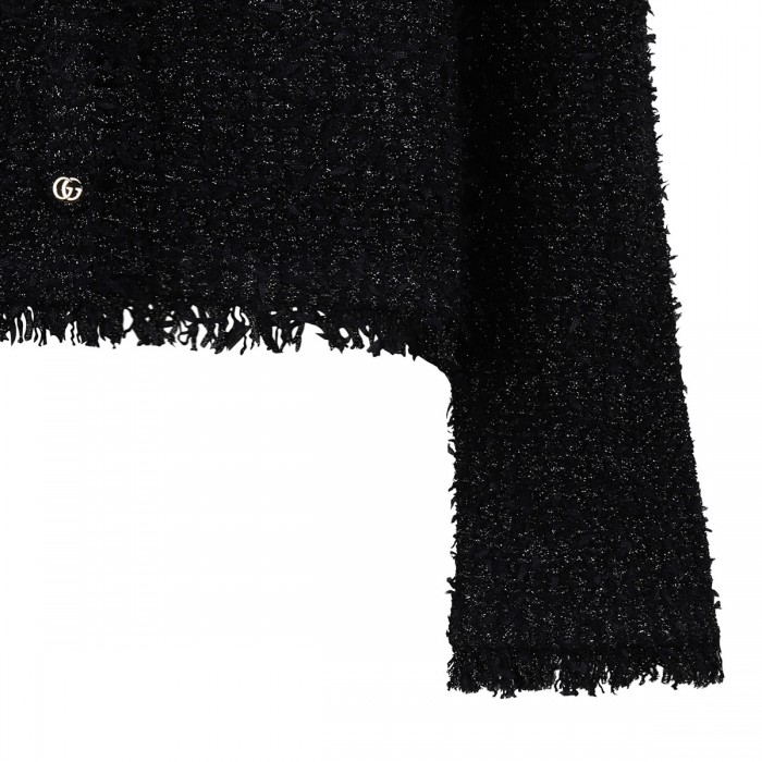 Black chunky lame and viscose cardigan from Gucci featuring double G button fastening, crew neck, dropped shoulders, long sleeves, front pockets, fringed trims, ribbed-knit edges.