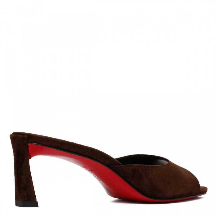 Brown suede leather Condora mule sandals from Christian Louboutin featuring 55 tapered heel, open squared toe, leather insole and iconic Loubi red leather sole.
