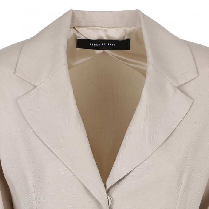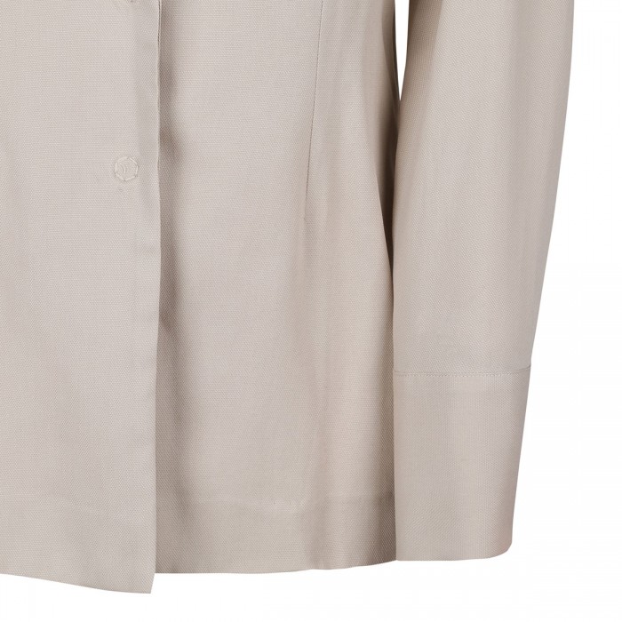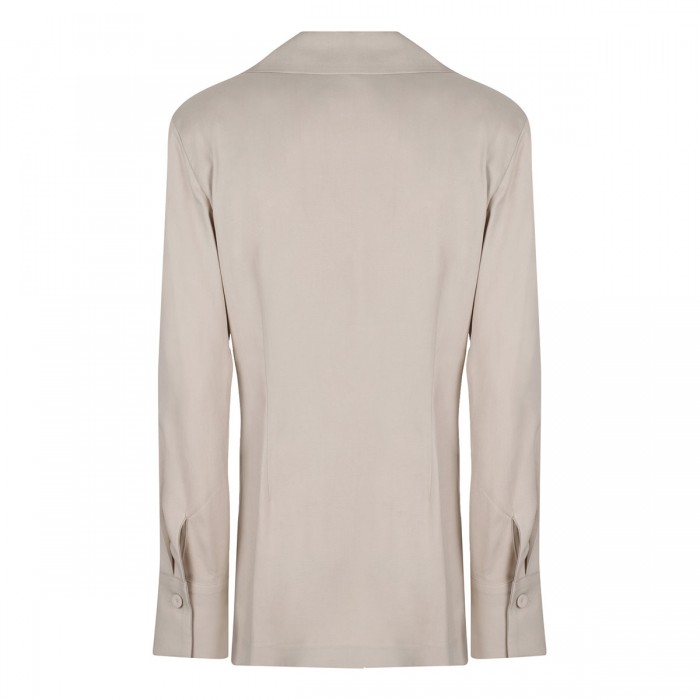 Sand hue viscose shirt from Federica Tosi featuring blazer-like collar, front button fastening, long sleeves with buttoned cuffs.