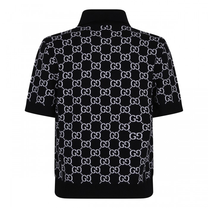 Black and white reversible fine wool polo shirt from Gucci featuring tubular GG jacquard stitch, pointed polo collar, short sleeves, button fastening, ribbed knit trims.