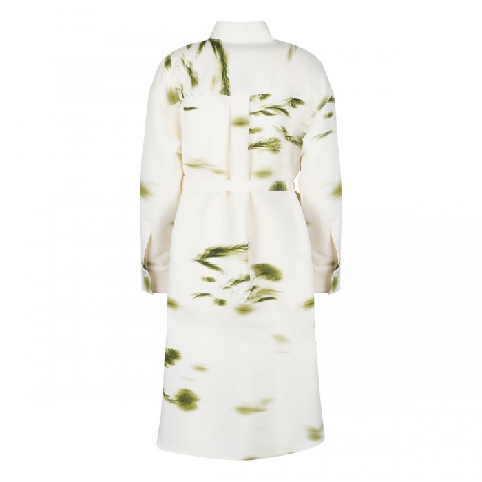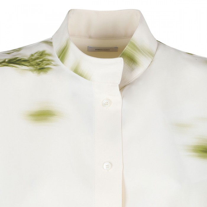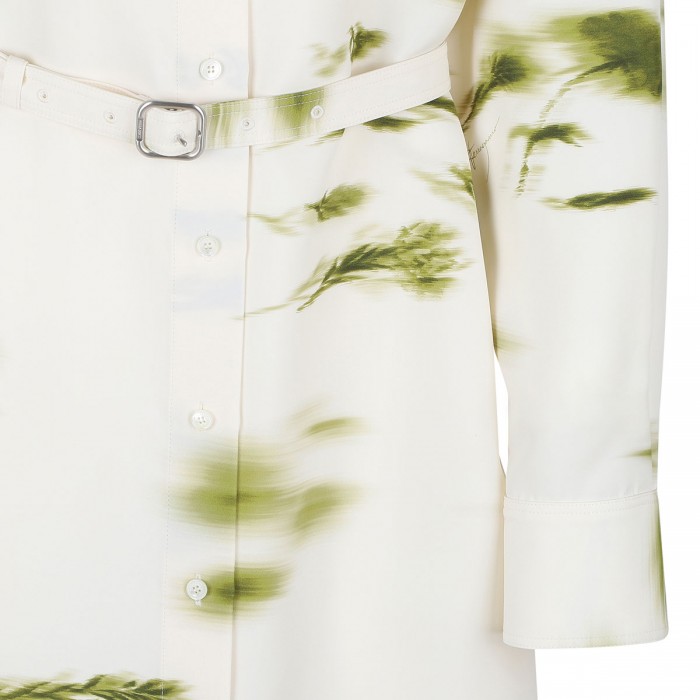 White viscose cady shirt dress from Ferragamo featuring green Blossom print, overlapping raised collar, slightly oversized fit, dropped shoulders, button fastening, asymmetrical rounded hem, long sleeves, roll up cuffs with button up straps, belt with eyelets and matte metallic buckle, back box pleat.