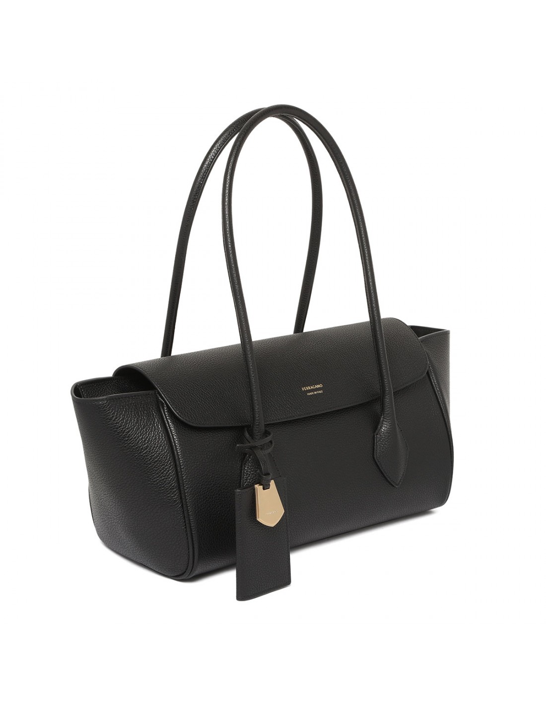 Black hammered calfskin East-West M tote bag from Ferragamo featuring long handles, front flap with logo, zip fastening beneath the flap, leather fob with golden plate, internal zipped pocket.