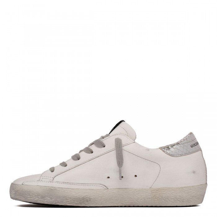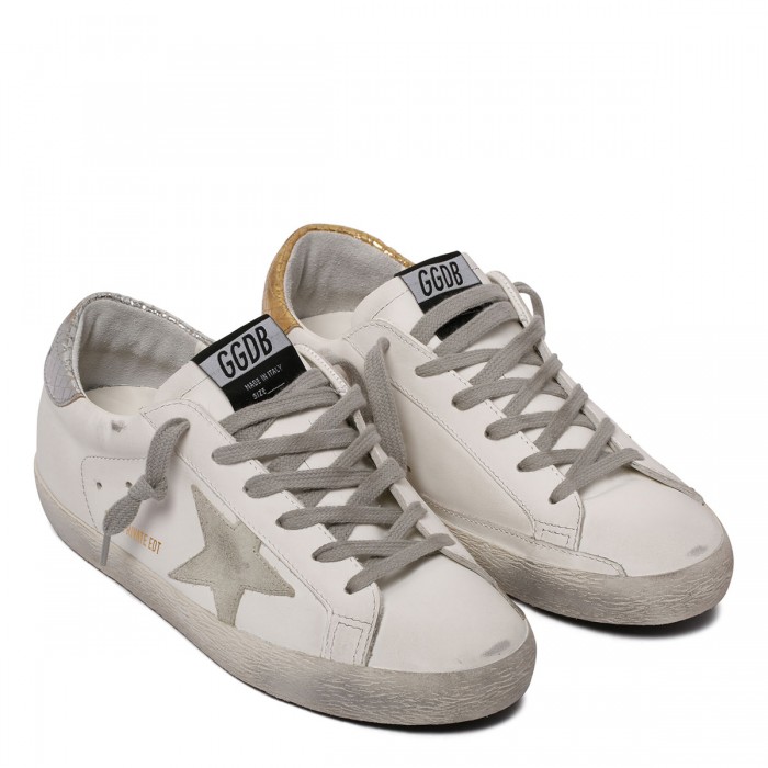 White leather SuperStar sneakers from Golden Goose featuring ice gray suede star on side,? golden logo printed on side, golden and silver embossed leather heel tab with logo, round toe, logo label on tongue, lace-up fastening, vintage finish, rubber sole.