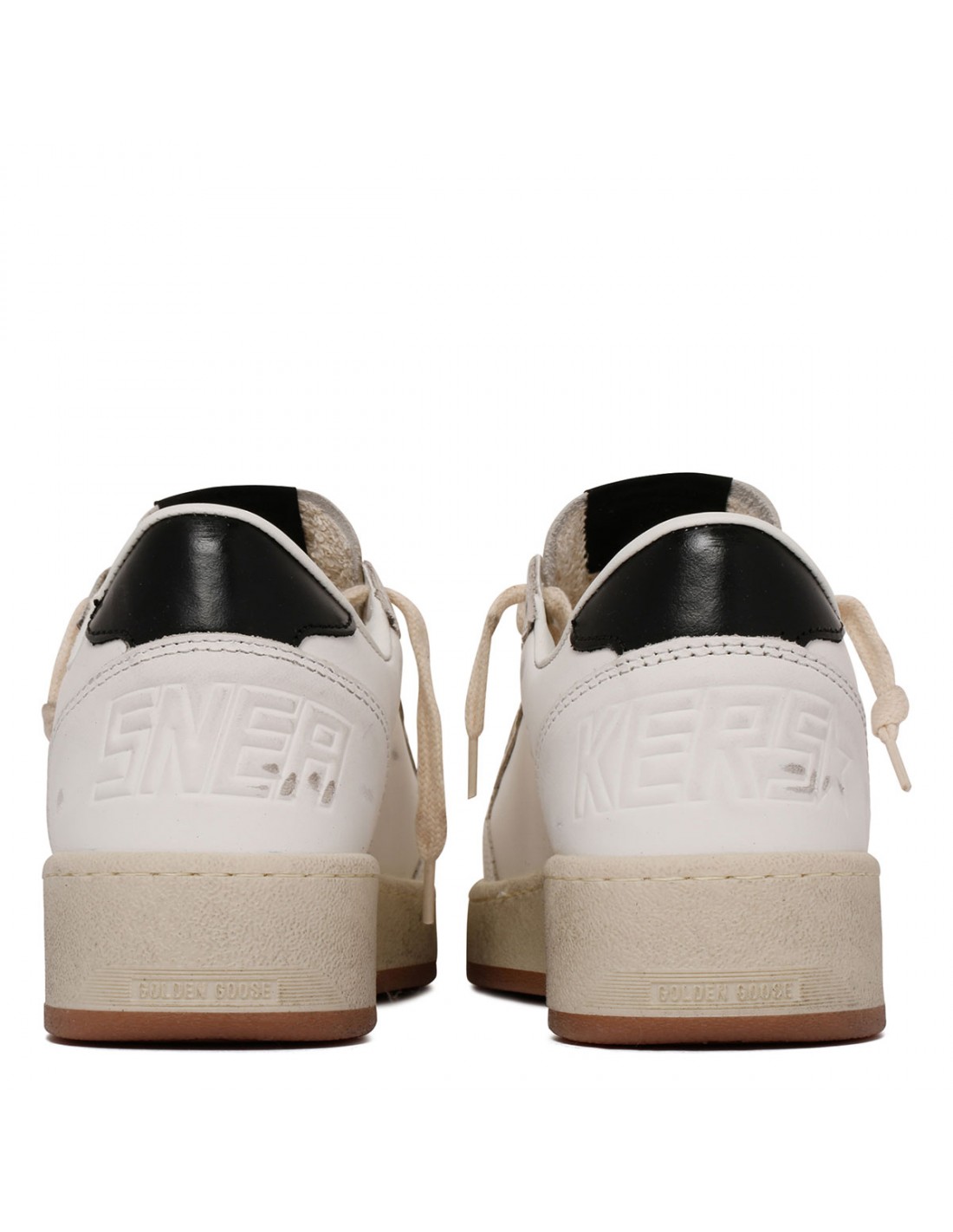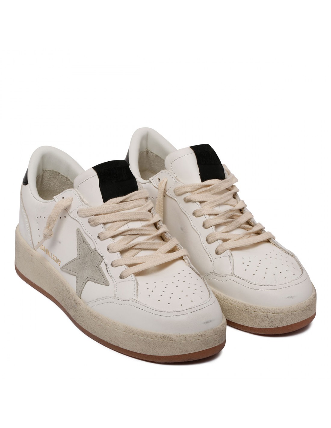 White leather BallStar sneakers from Golden Goose featuring gray suede star on side, black insert on tongue, black heel tab, Sneakers embossed on heel, perforated toe cap, round toe, lace-up closure, lived-in finish, rubber sole.