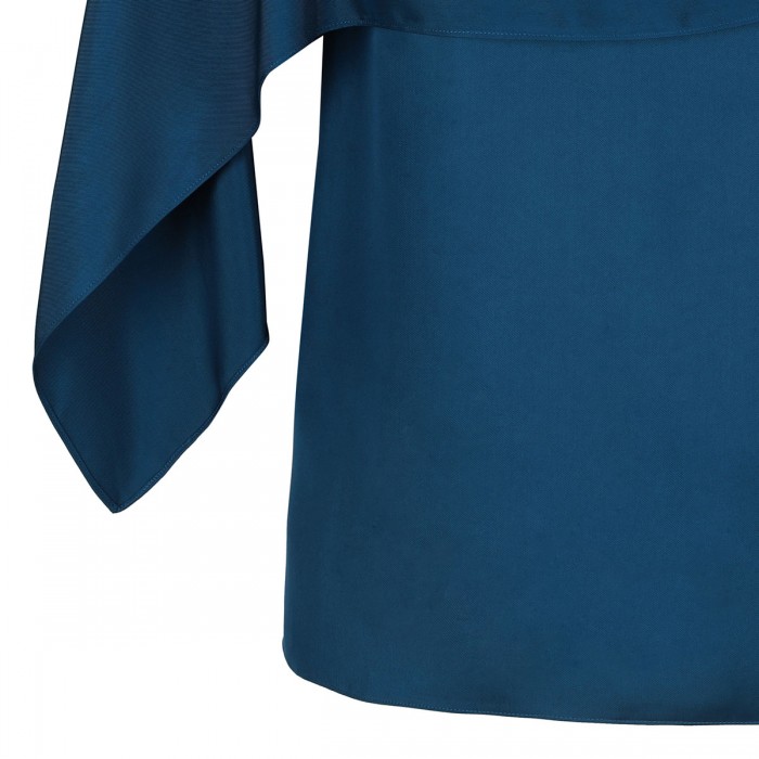 Teal blue pure viscose top from Ferragamo featuring asymmetric cape detail, draped fluid silhouette, round neck.