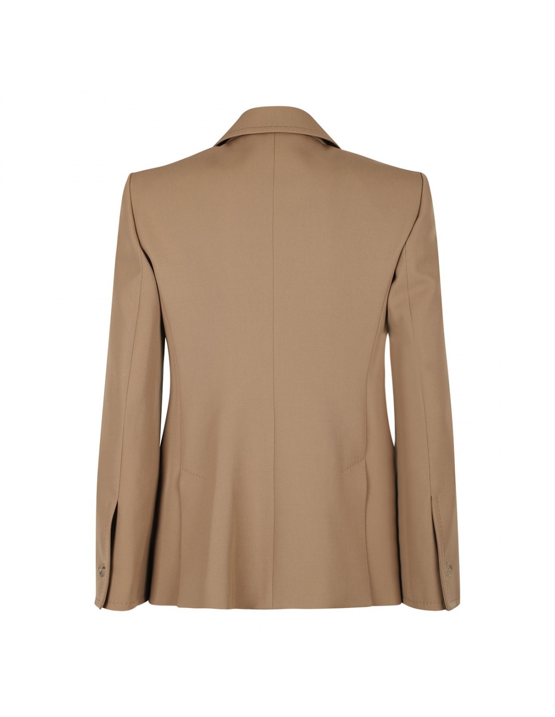 Camel hue wool Palchi blazer from Max Mara featuring single-breasted silhouette, peaked lapels, single-button closure at front, structured shoulders, long sleeves with buttoned cuffs, front flap pockets, back vents.