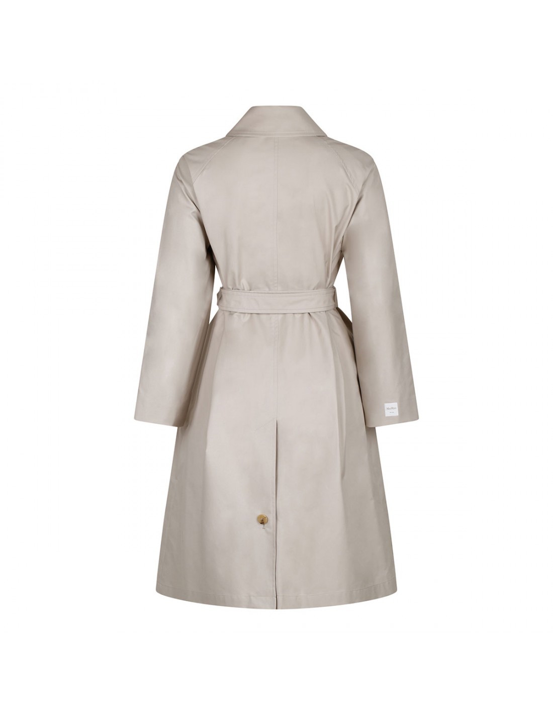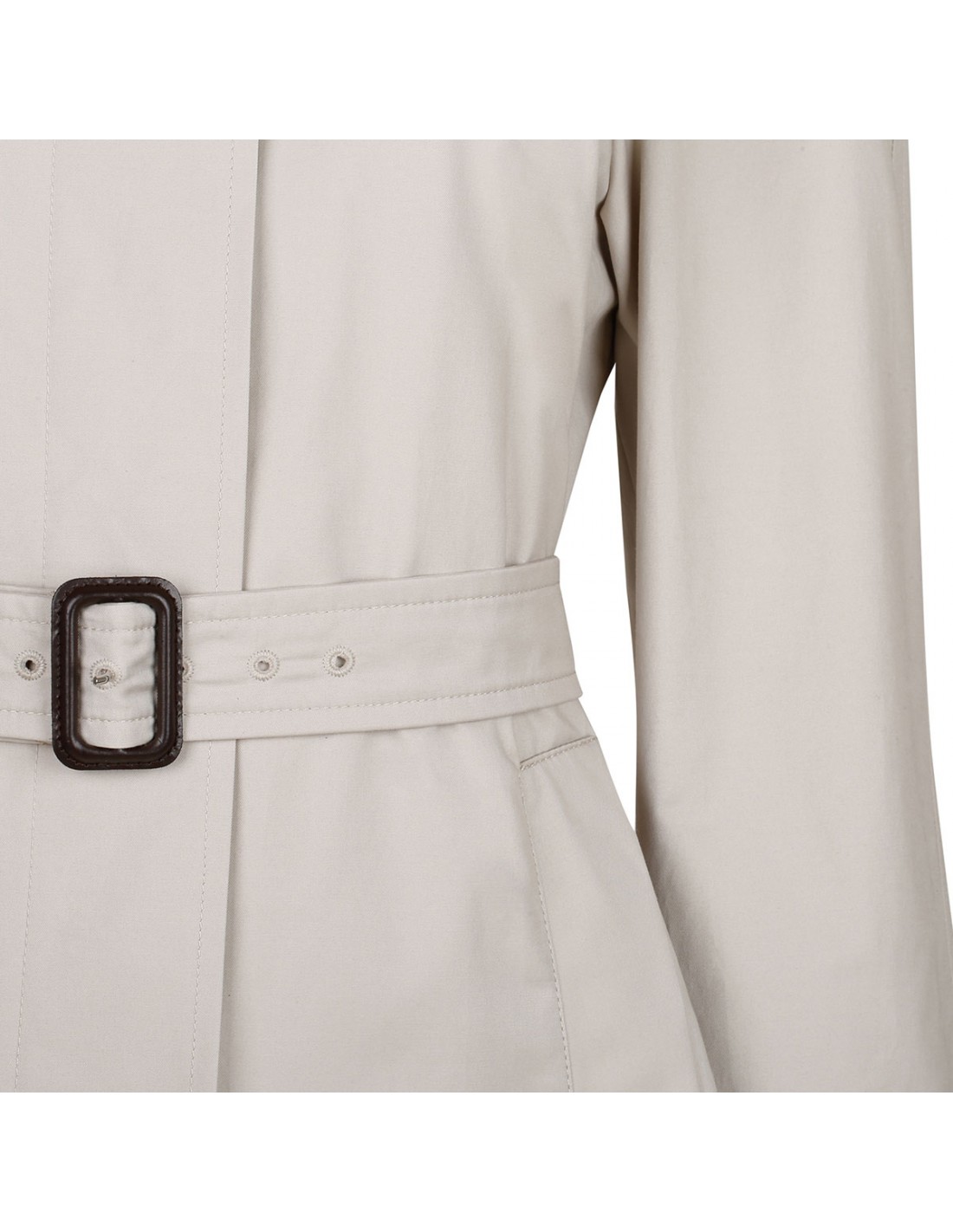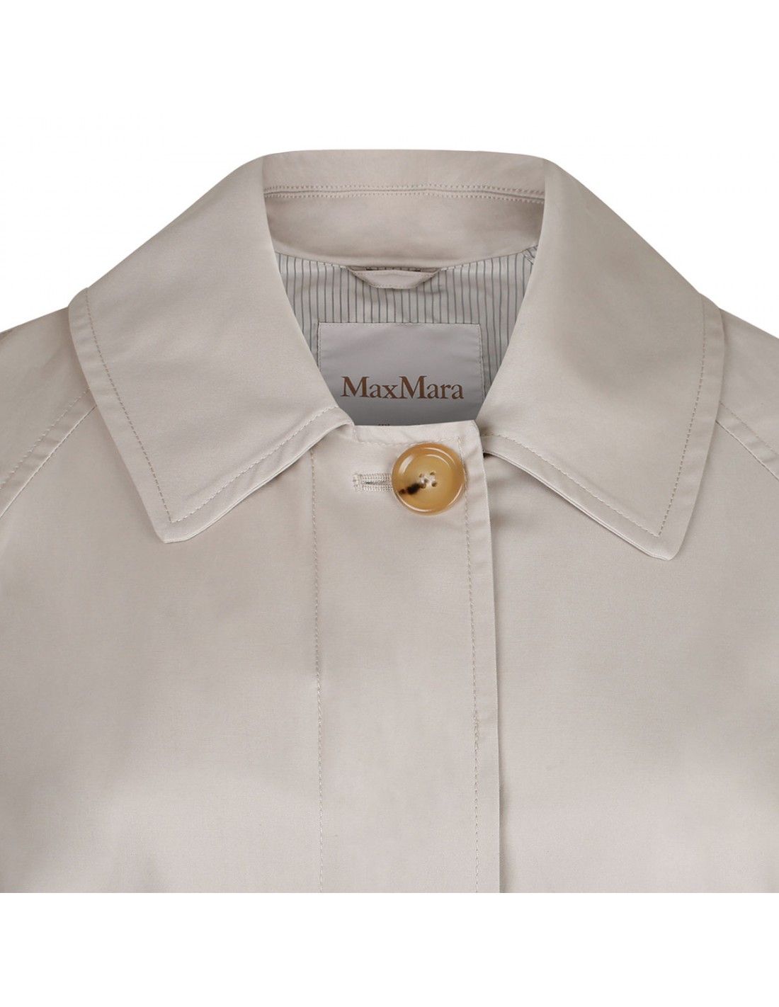 Ivory water-repellent twill Orleans trench coat from Max Mara The Cube featuring pointed collar, long raglan sleeves, matching belt with buckle closure, concealed horn button fastening, side pockets and back vent. Half-lined in taffeta fabric.