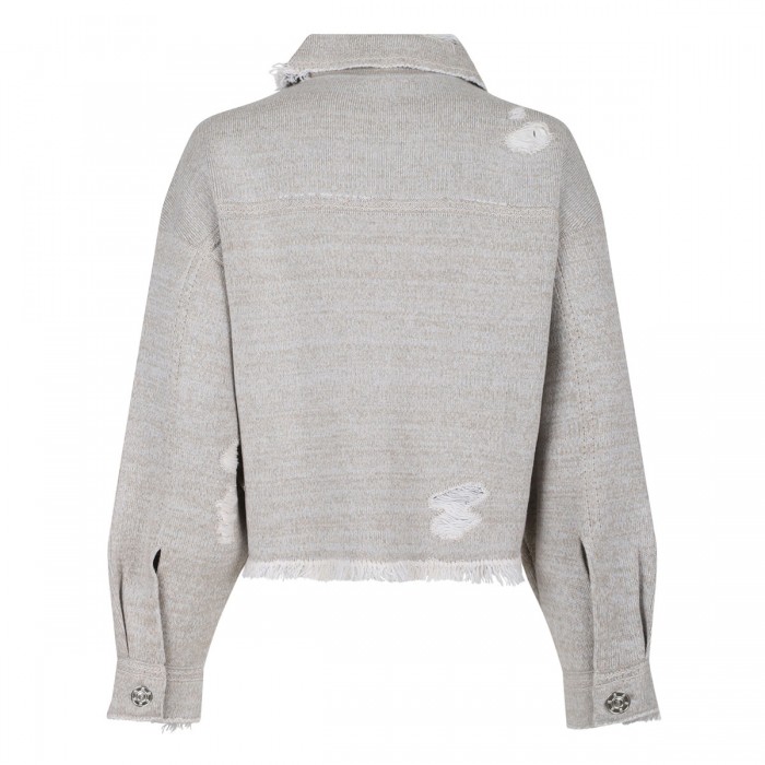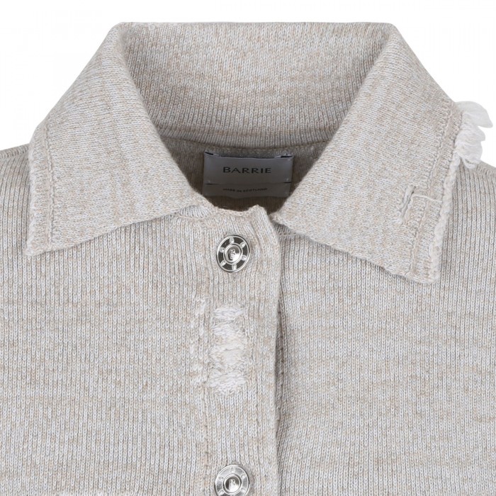 Light gray cashmere and cotton trompe l'oeil denim jacket from Barrie featuring fringed details, distressed look, metal logo button closure, loose fit, pointed collar, buttoned cuffs, double buttoned flap pocket on chest.