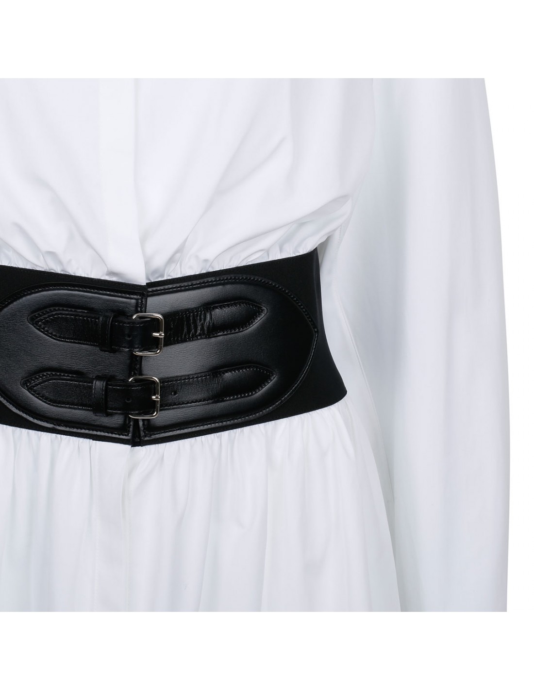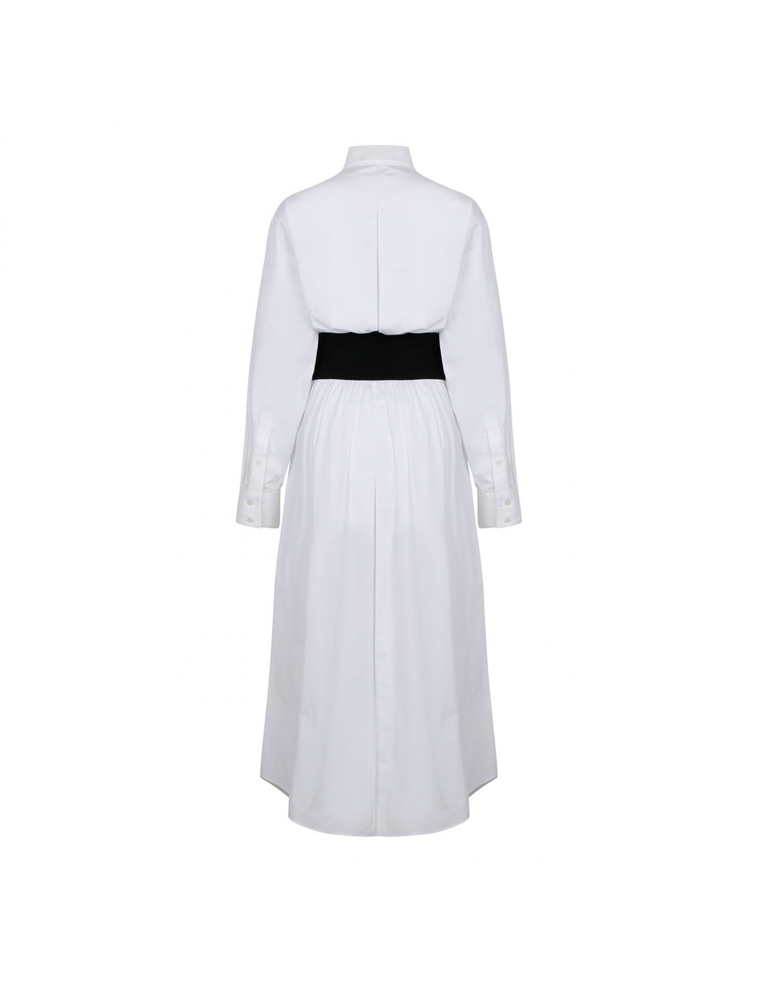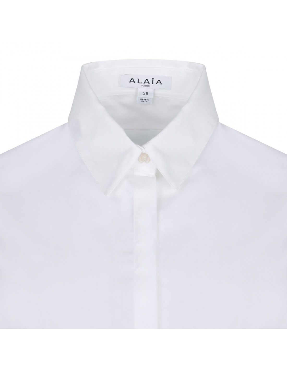 Alaia's shirt dress is crafted from white cotton poplin. It boasts a classic collar, a button-down front, long sleeves with buttoned cuffs, and an elastic waist with a leather detail. The dress also has hidden side pockets and a rounded hem with side slits. It is unlined.