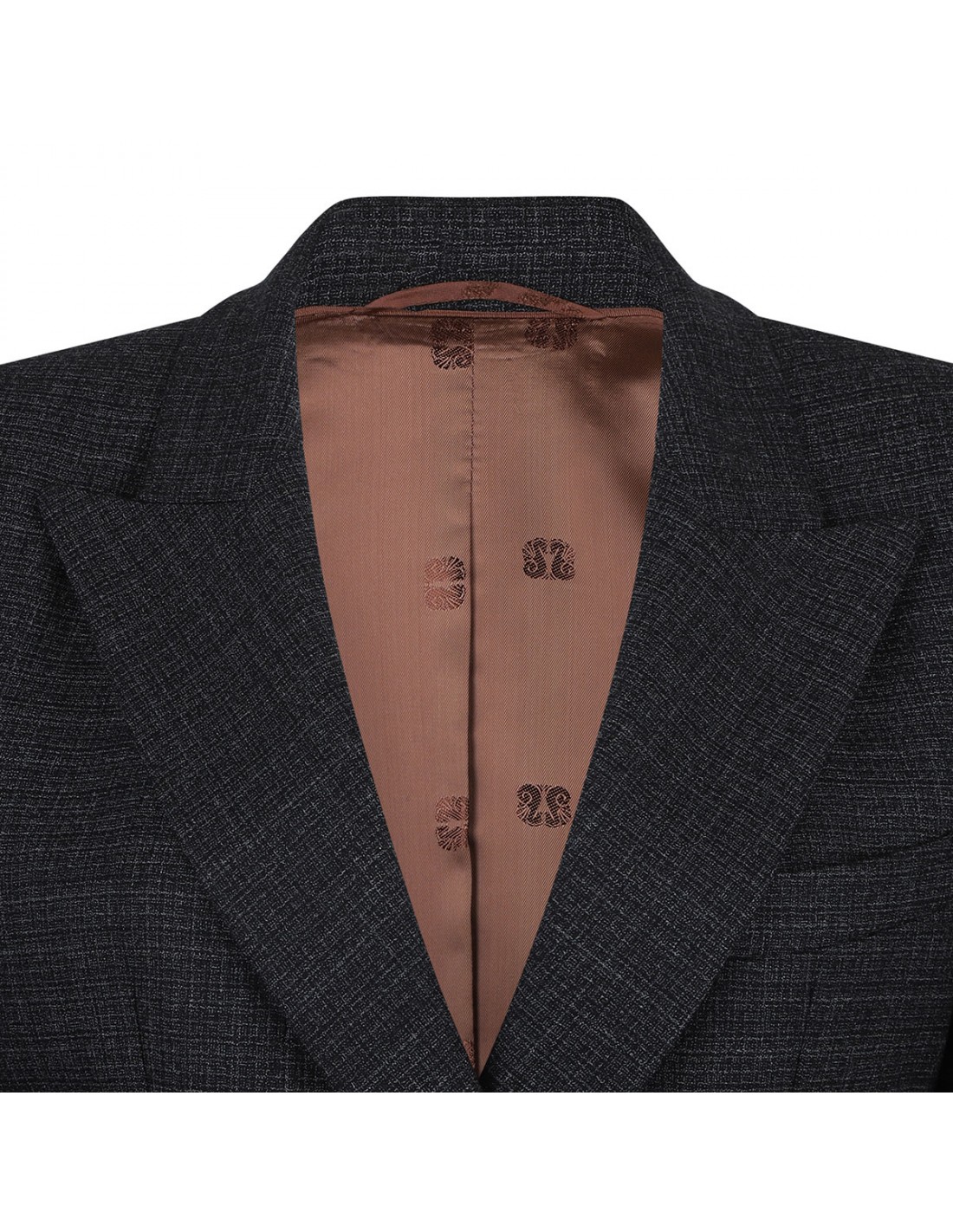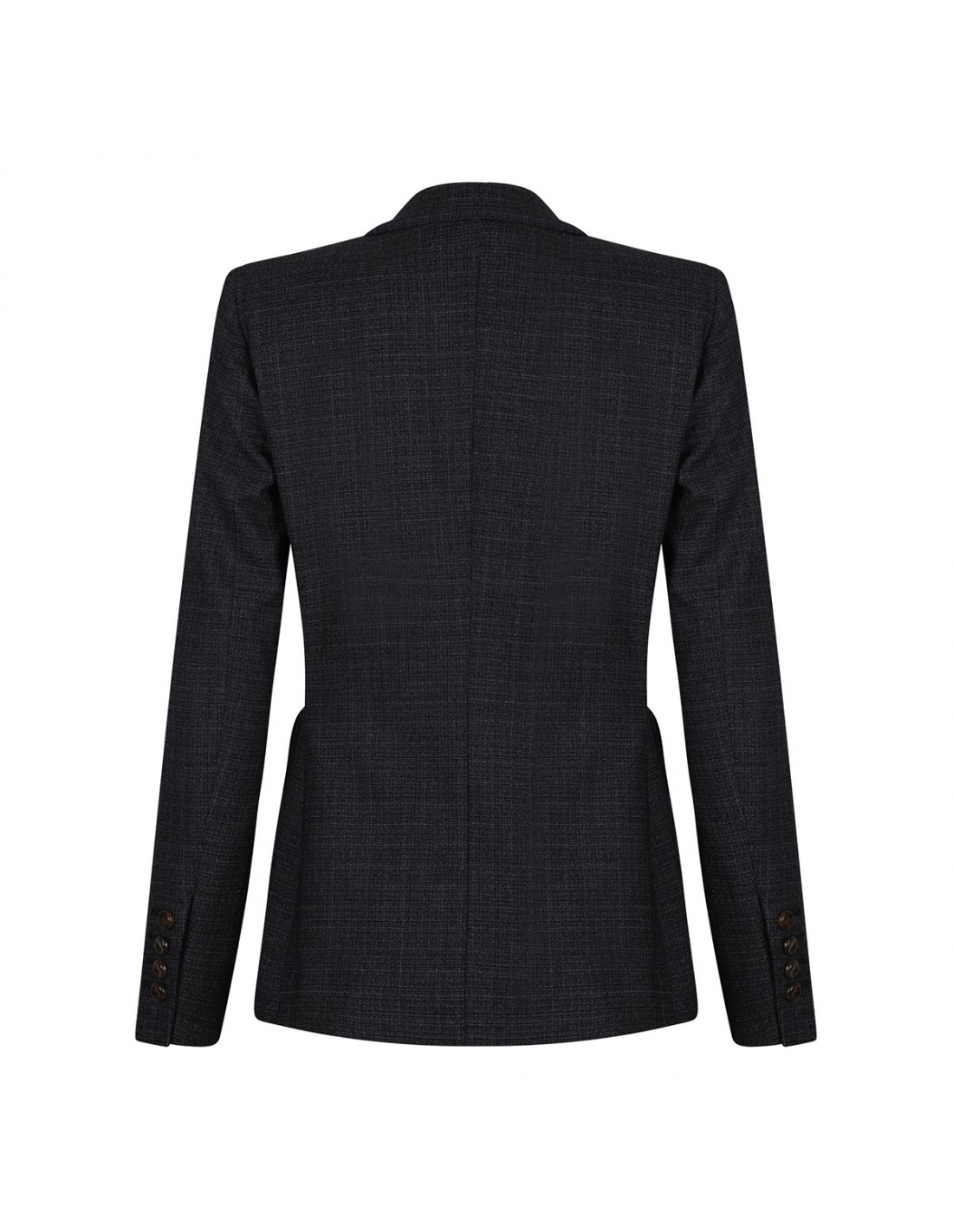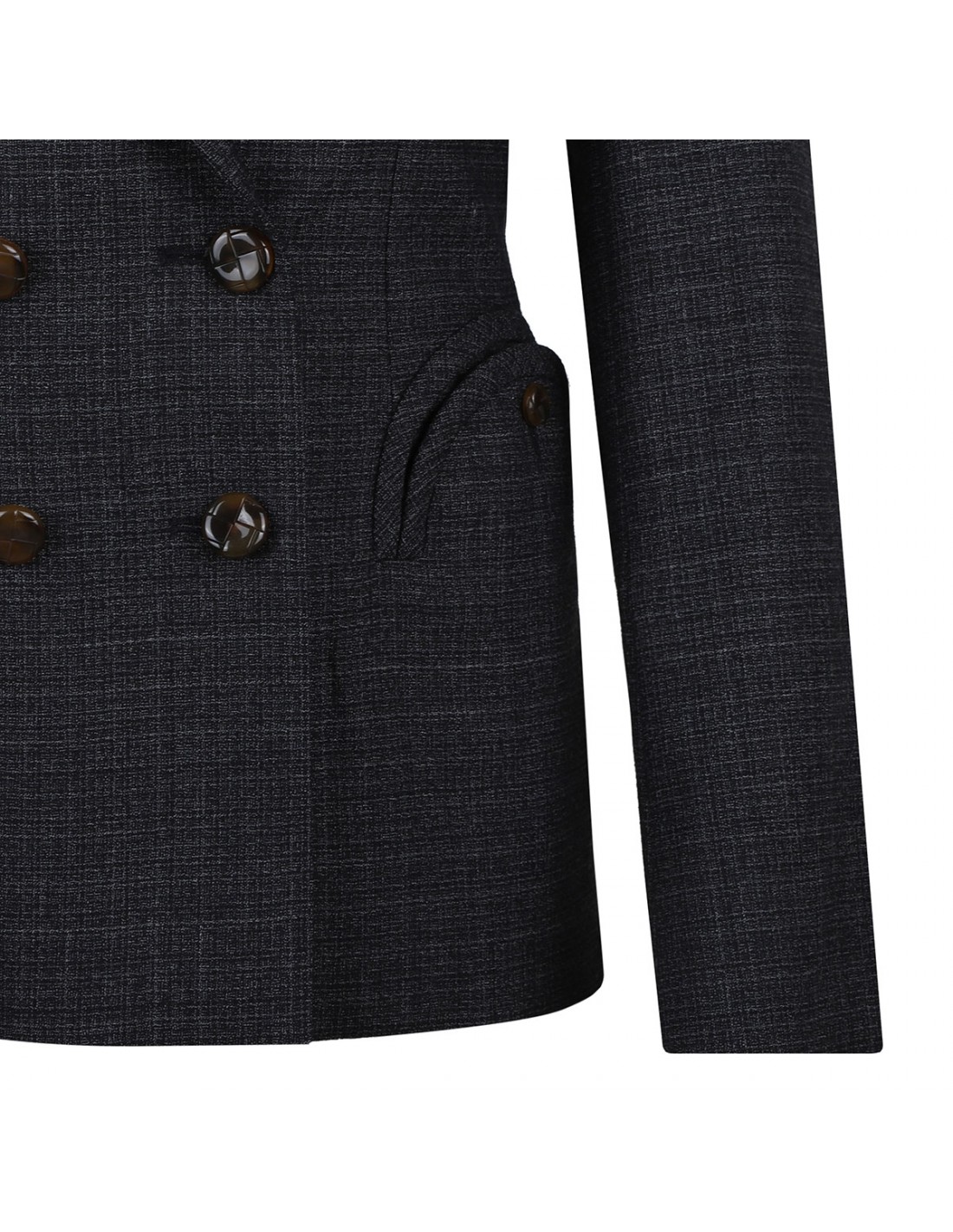 The 'Hunley Charmer' blazer is made of wool, featuring a double-breasted design with button closure, pockets, and long sleeves.