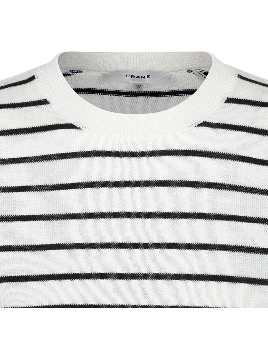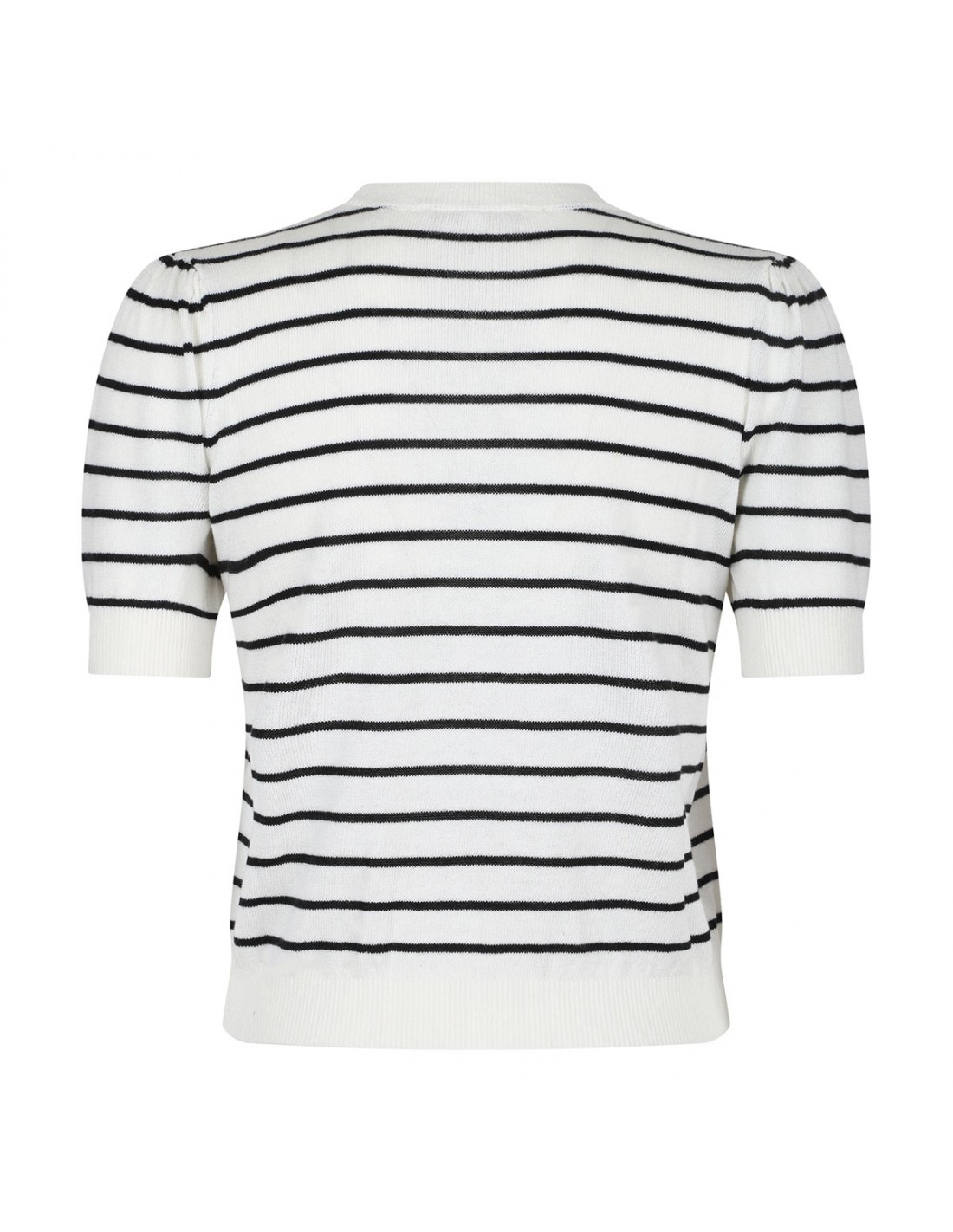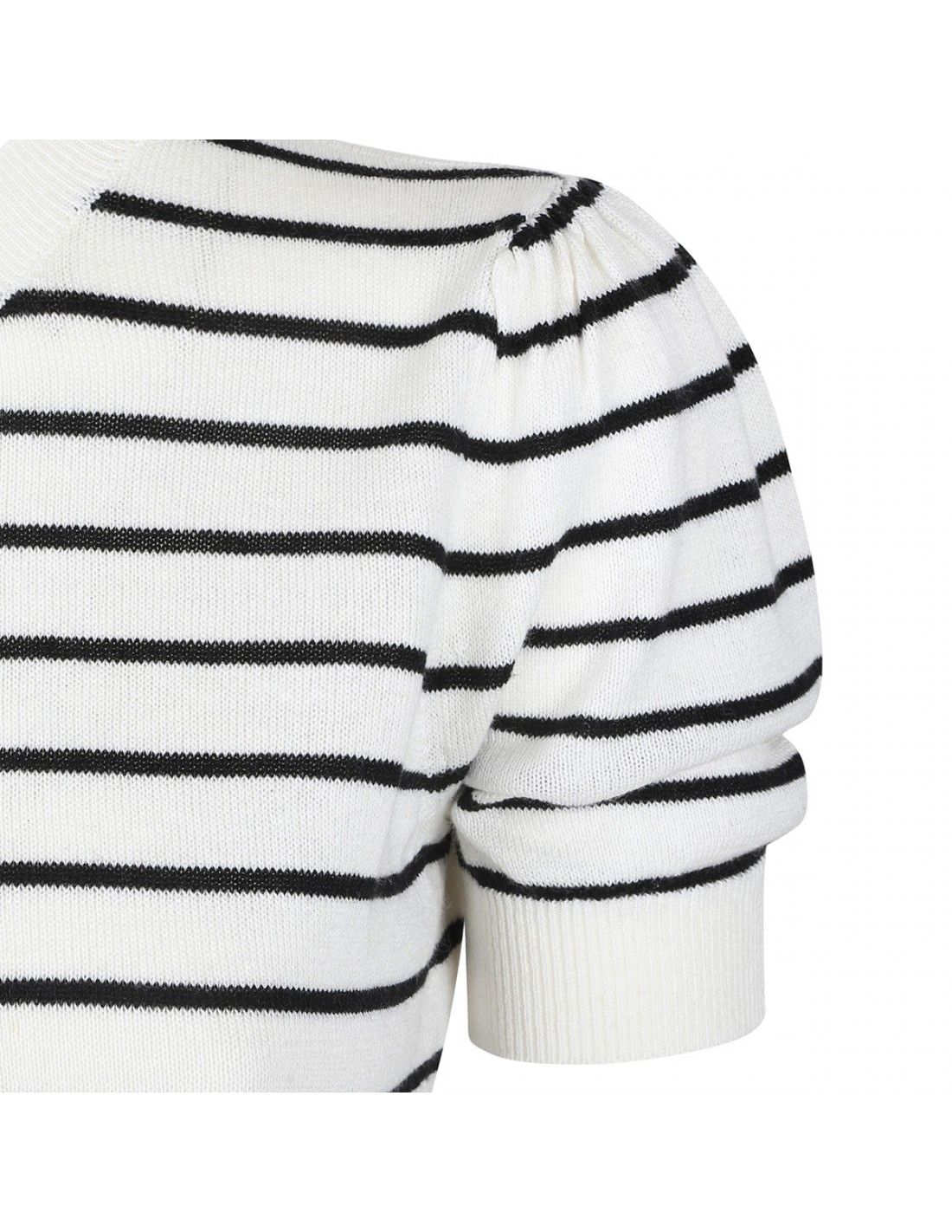 Cream white and black linen and cotton blend The Gathered sweater from Frame featuring striped motif, short sleeves with soft pleating, crew collar, ribbed-knit edges.