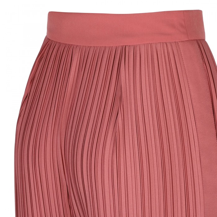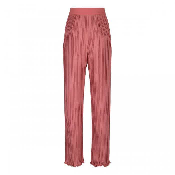 Peach pink pleated charmeuse pants from Lanvin featuring slightly flared silhouette, concealed side pocket, hidden zip fastening at side, ruffled bottom.
