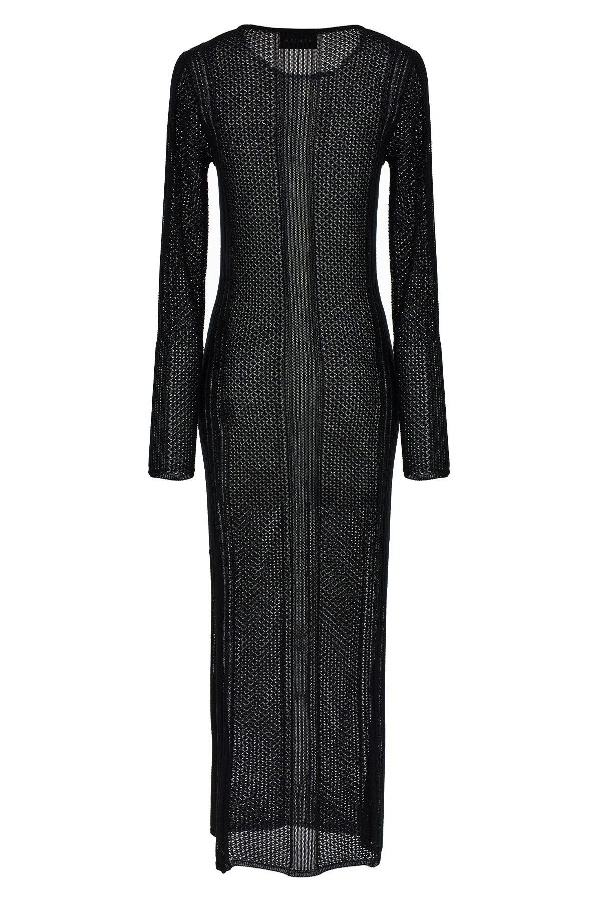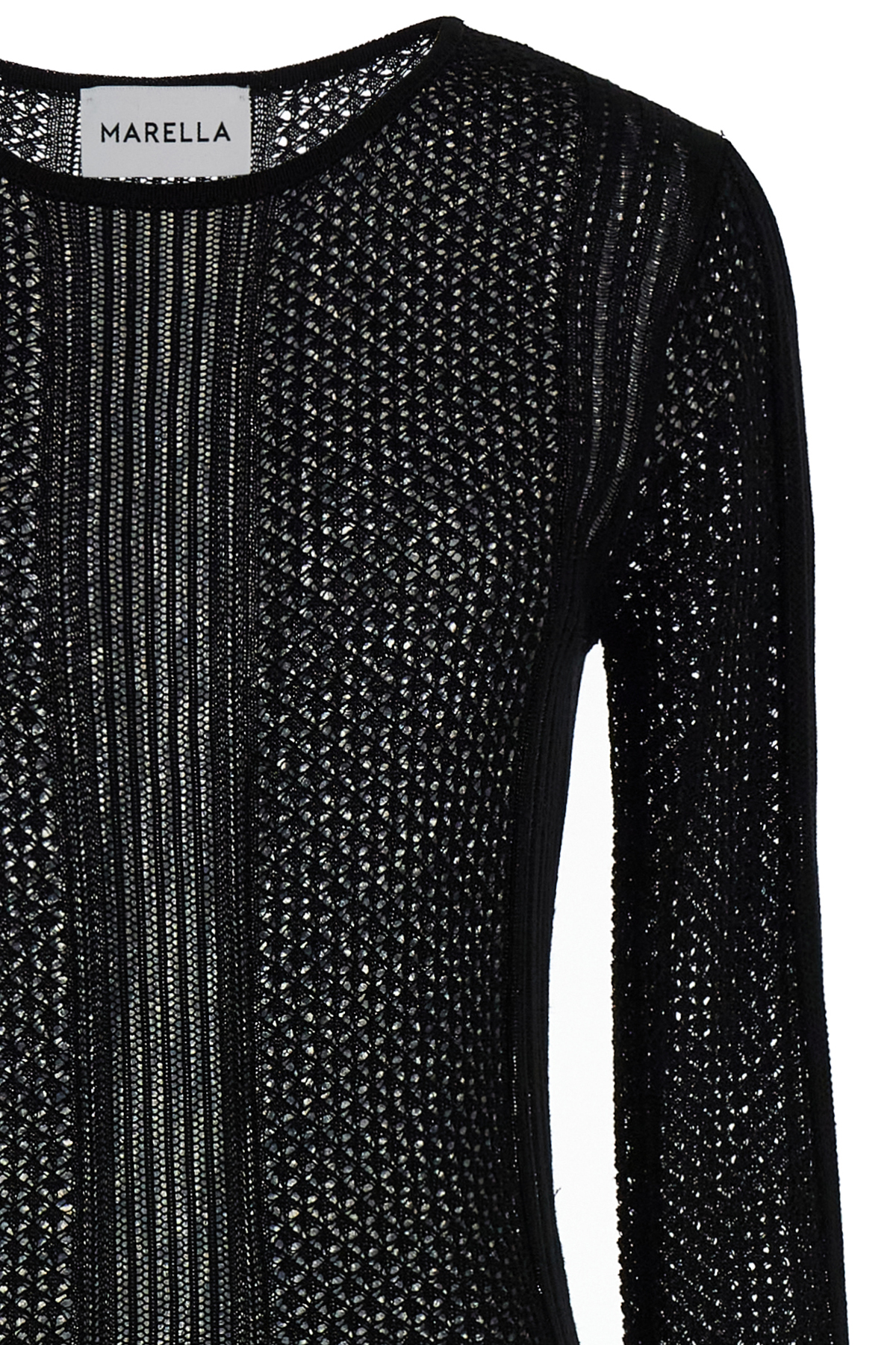 Emily Ratajkowski x Marella capsule dress in perforated viscose blend knit with round neckline, long sleeves, side slits.