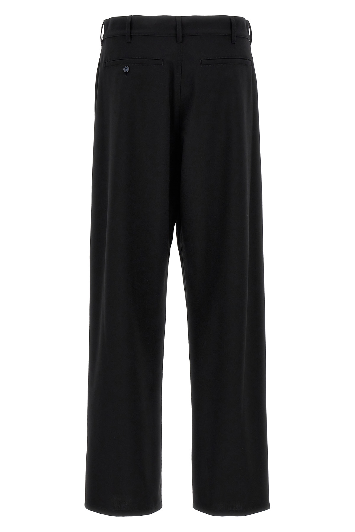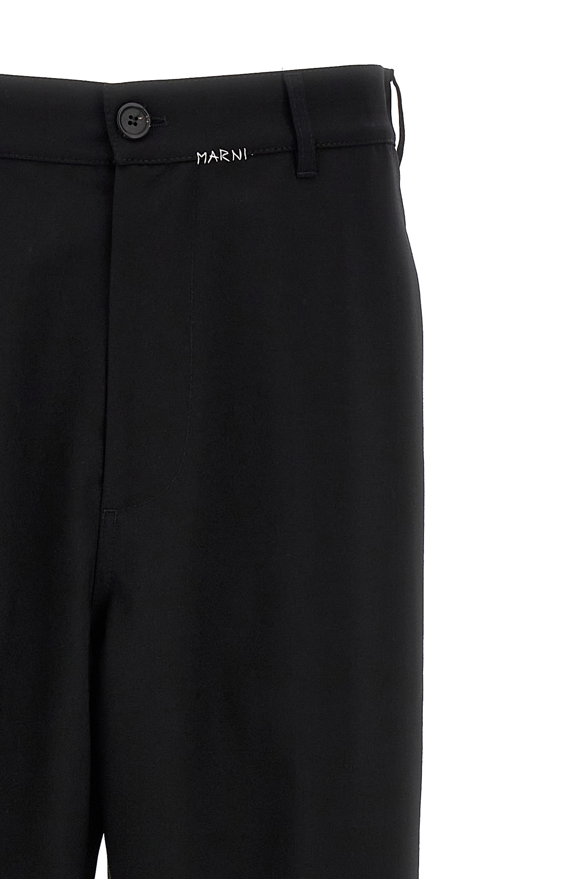 Wool blend trousers, contrast logo embroidery at the waist, zip and button closure, pockets.