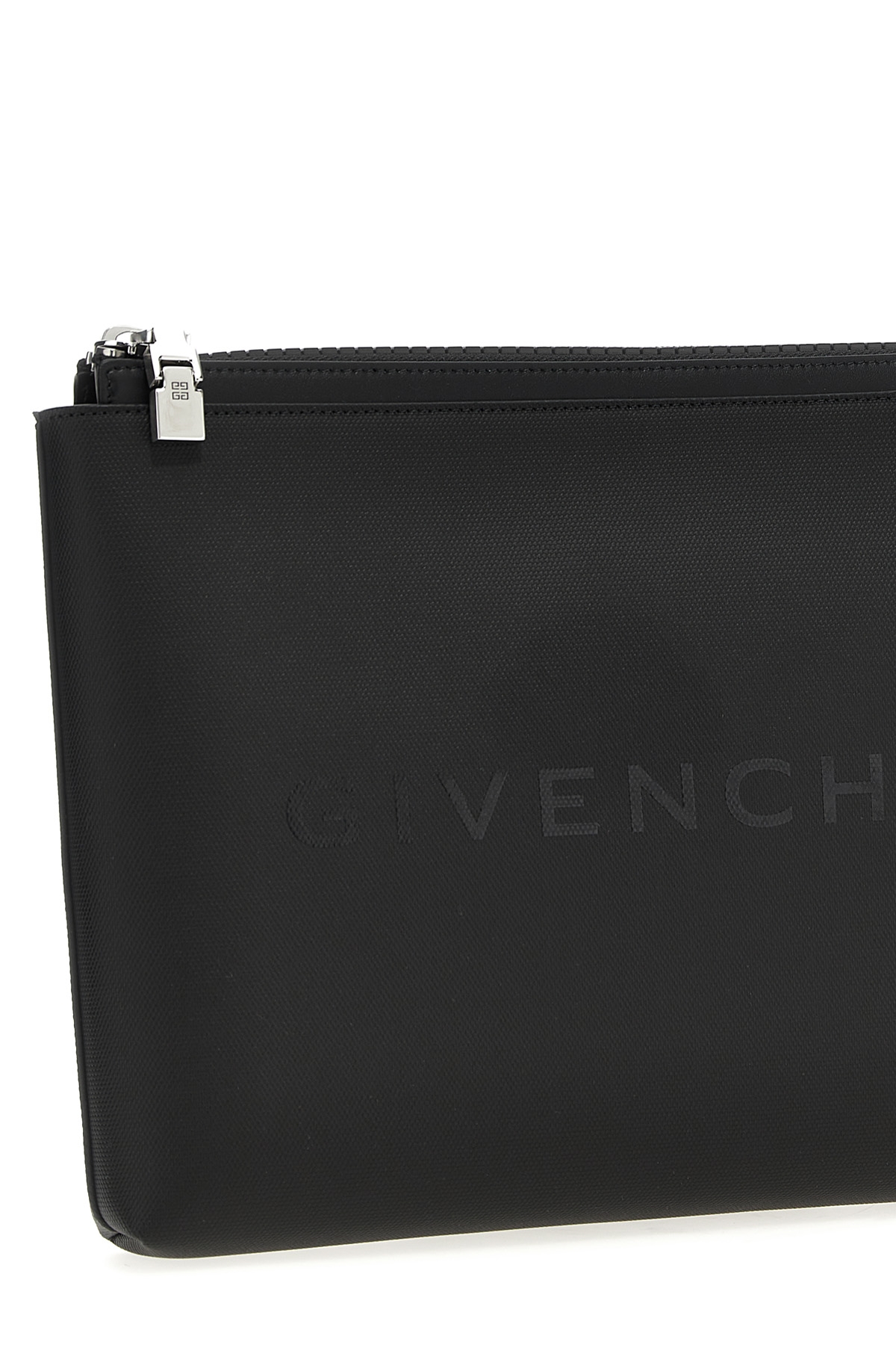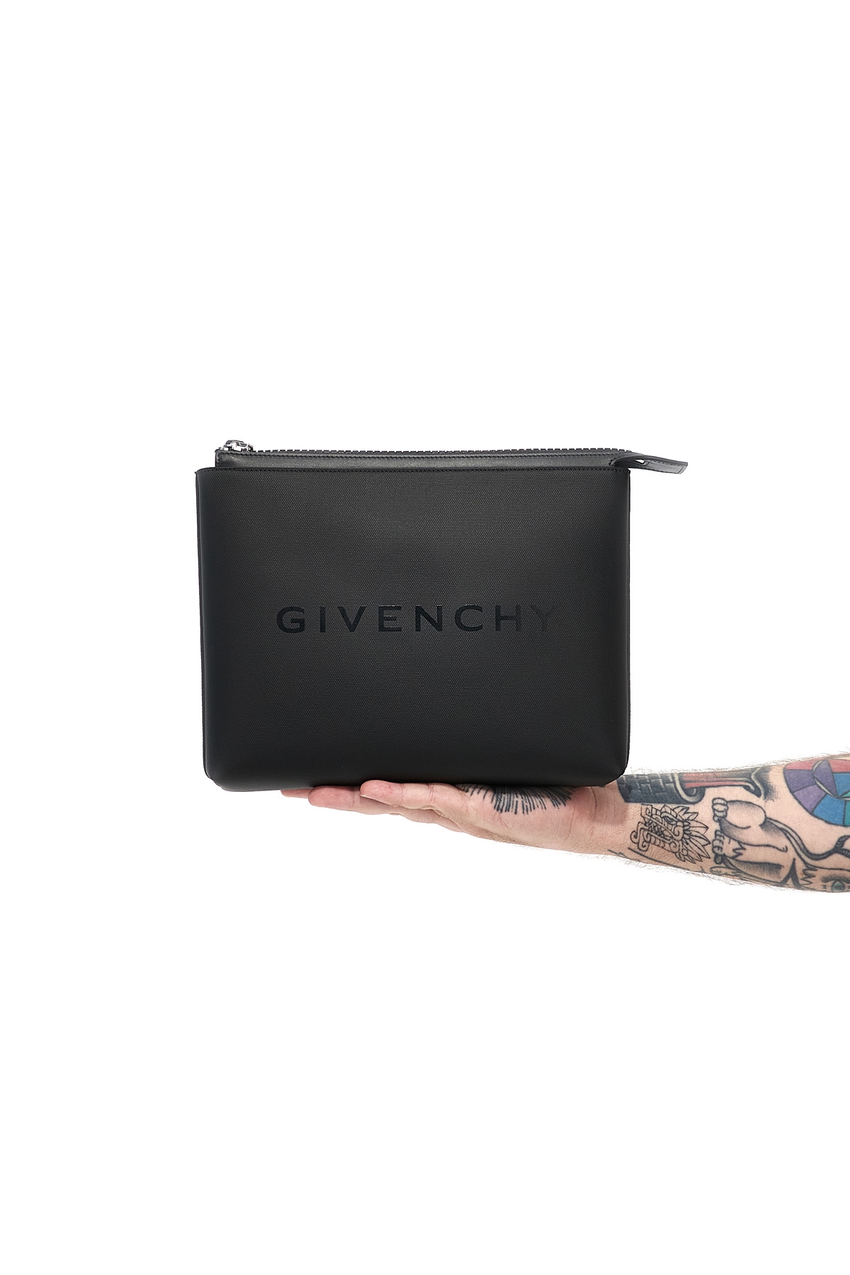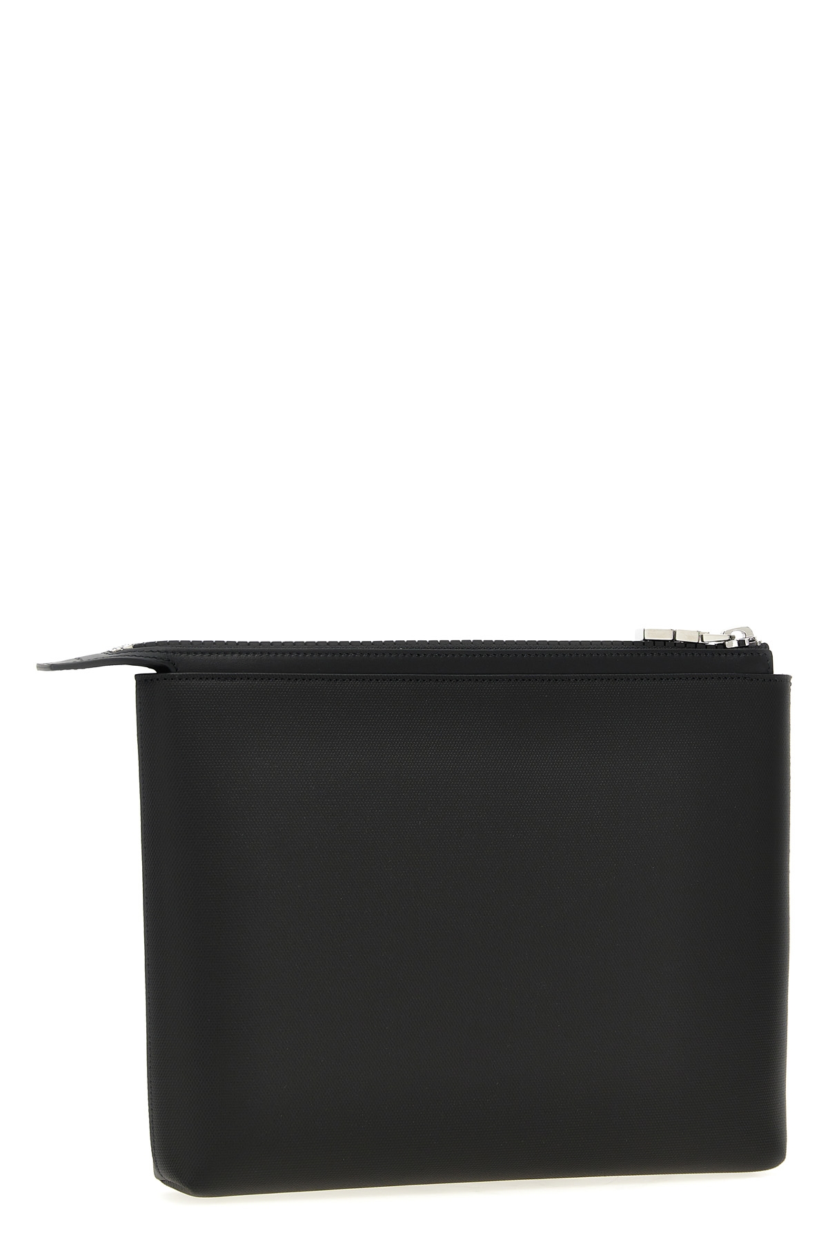 Clutch bag in coated fabric with front logo print, zip closure.