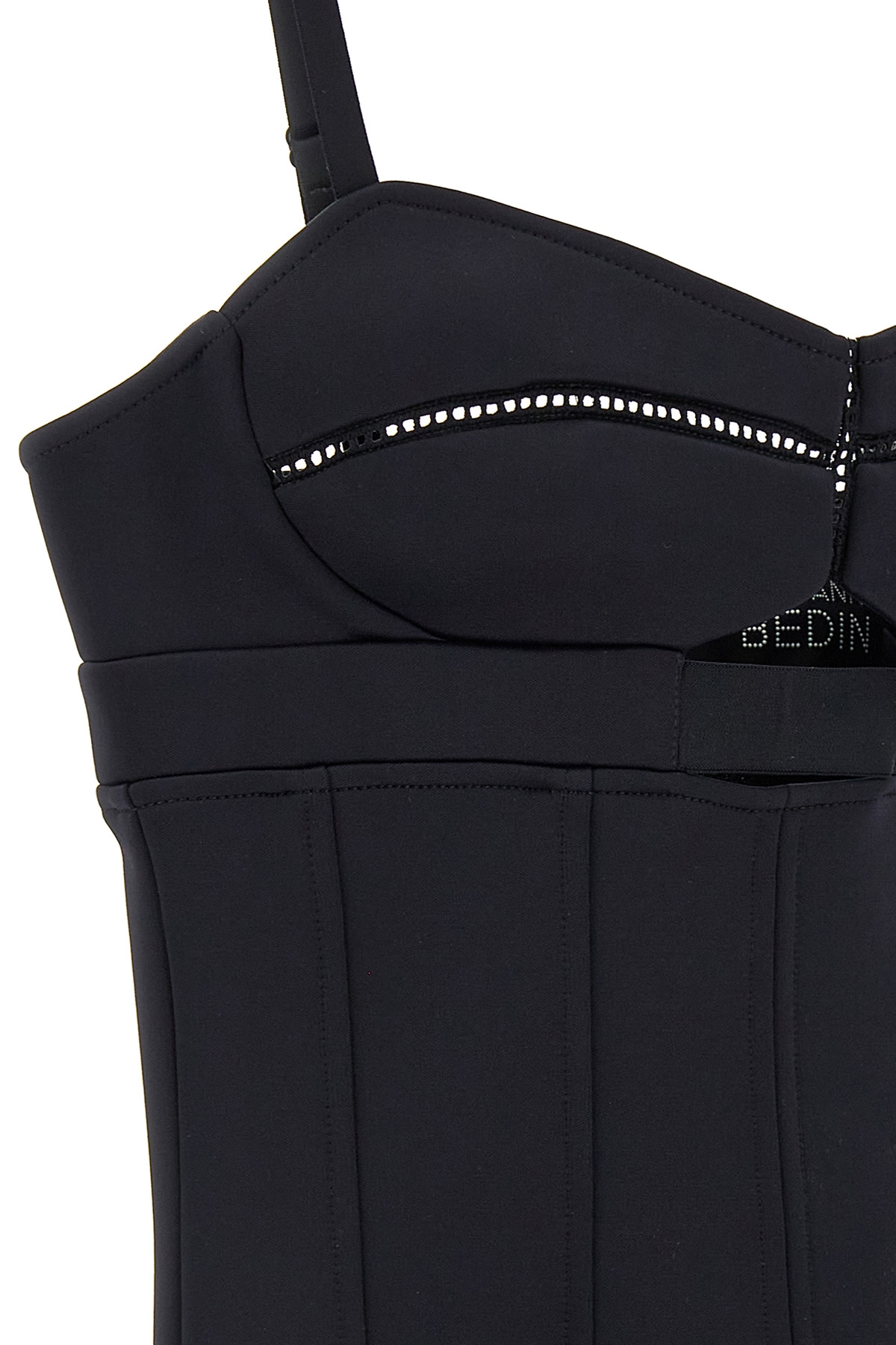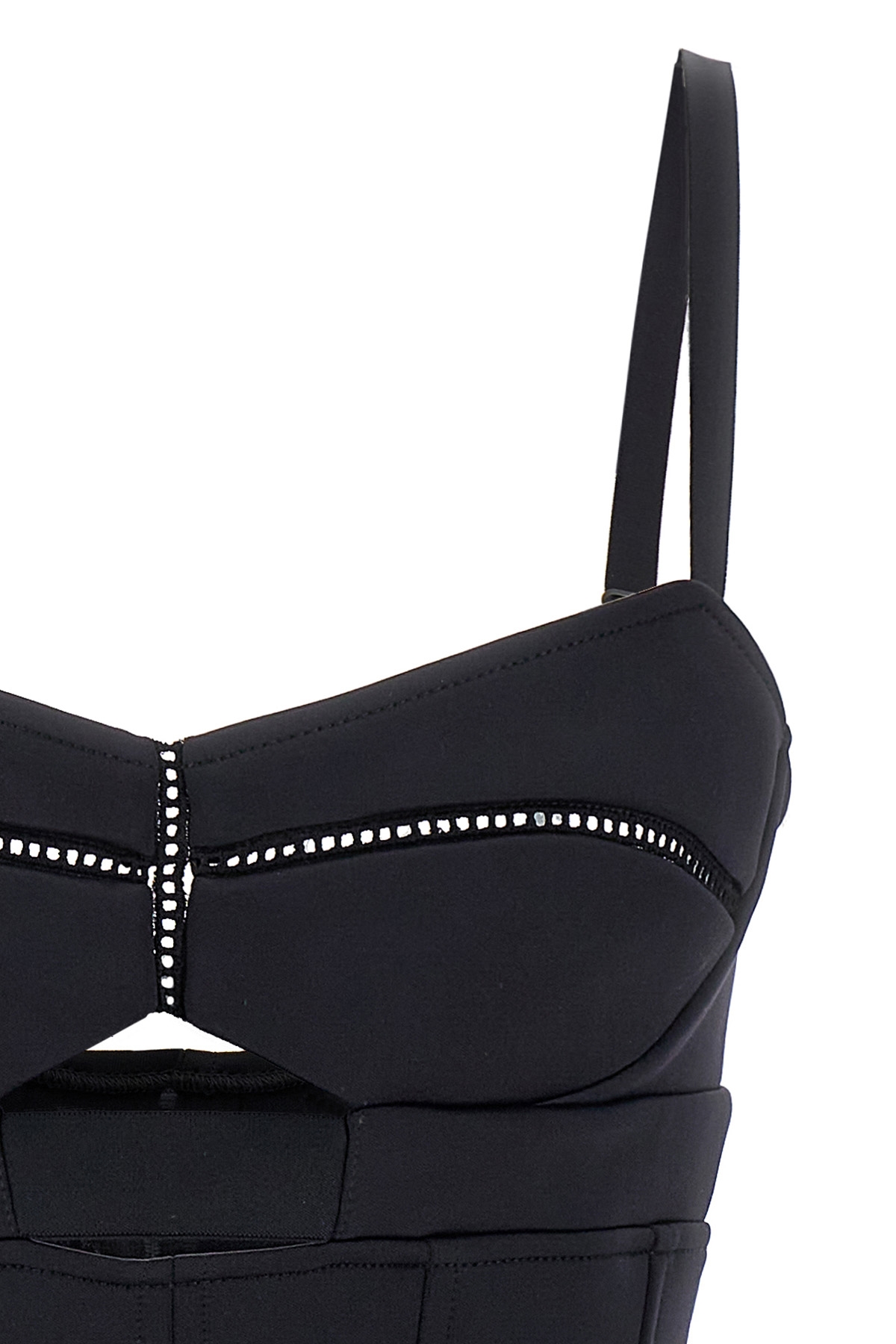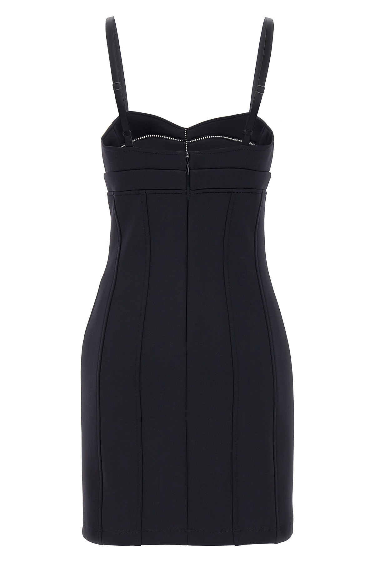 Cotton blend scuba mini dress with adjustable straps, pre-shaped cups, crochet inserts, front cut-out detail, back zip closure.
