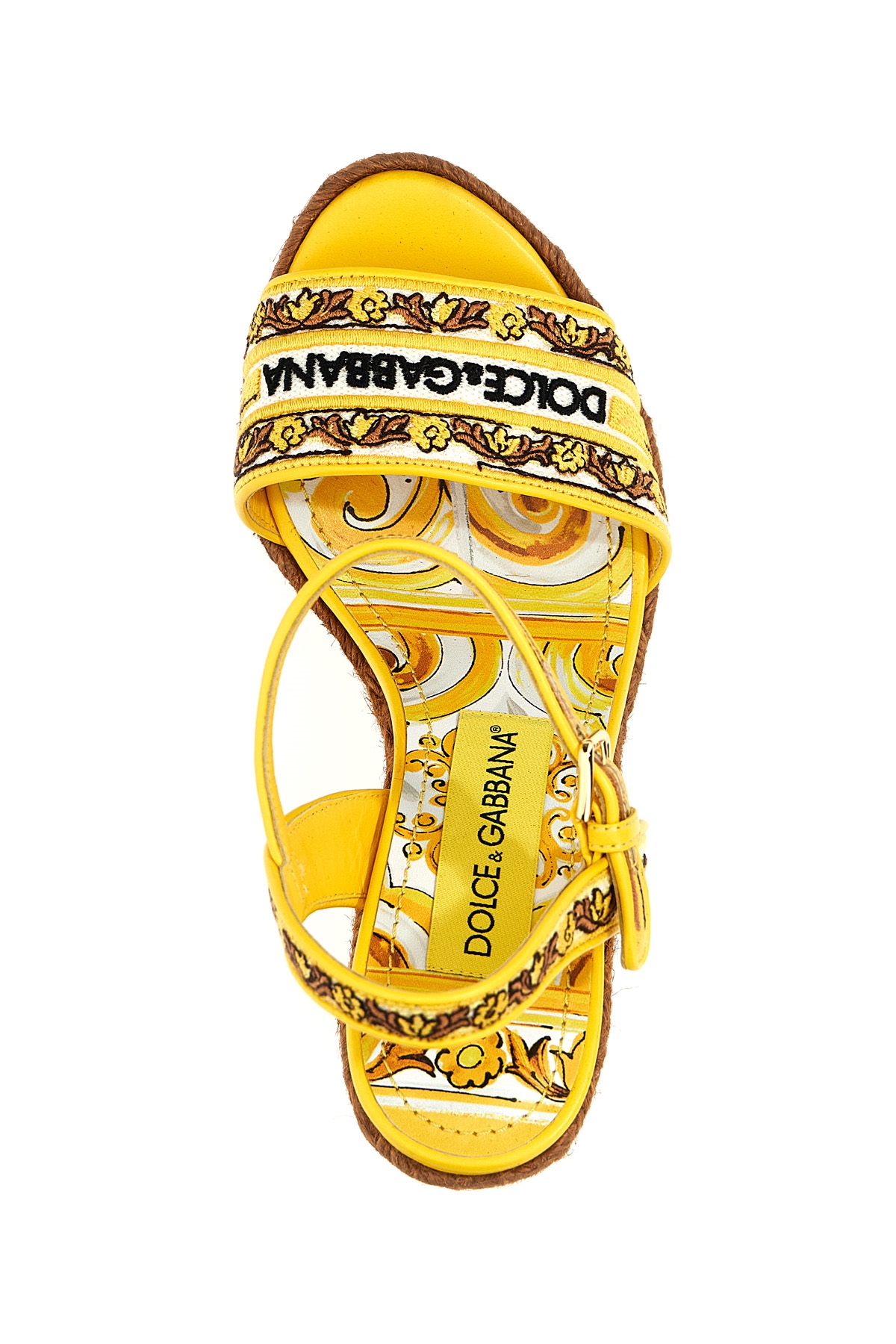 Wedge with thread-embroidered Maiolica pattern, ankle strap, leather insole, rope bottom, rubber sole.