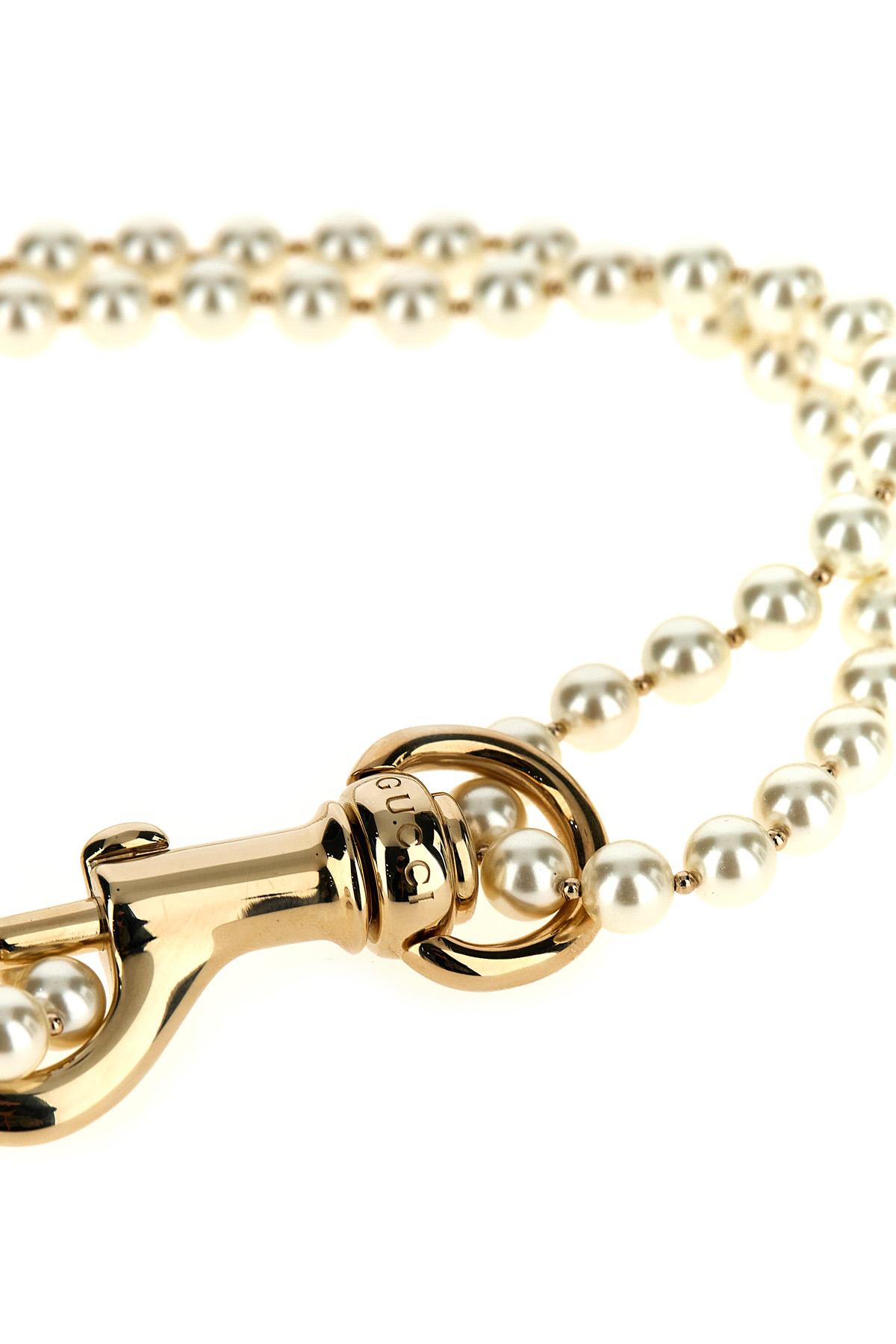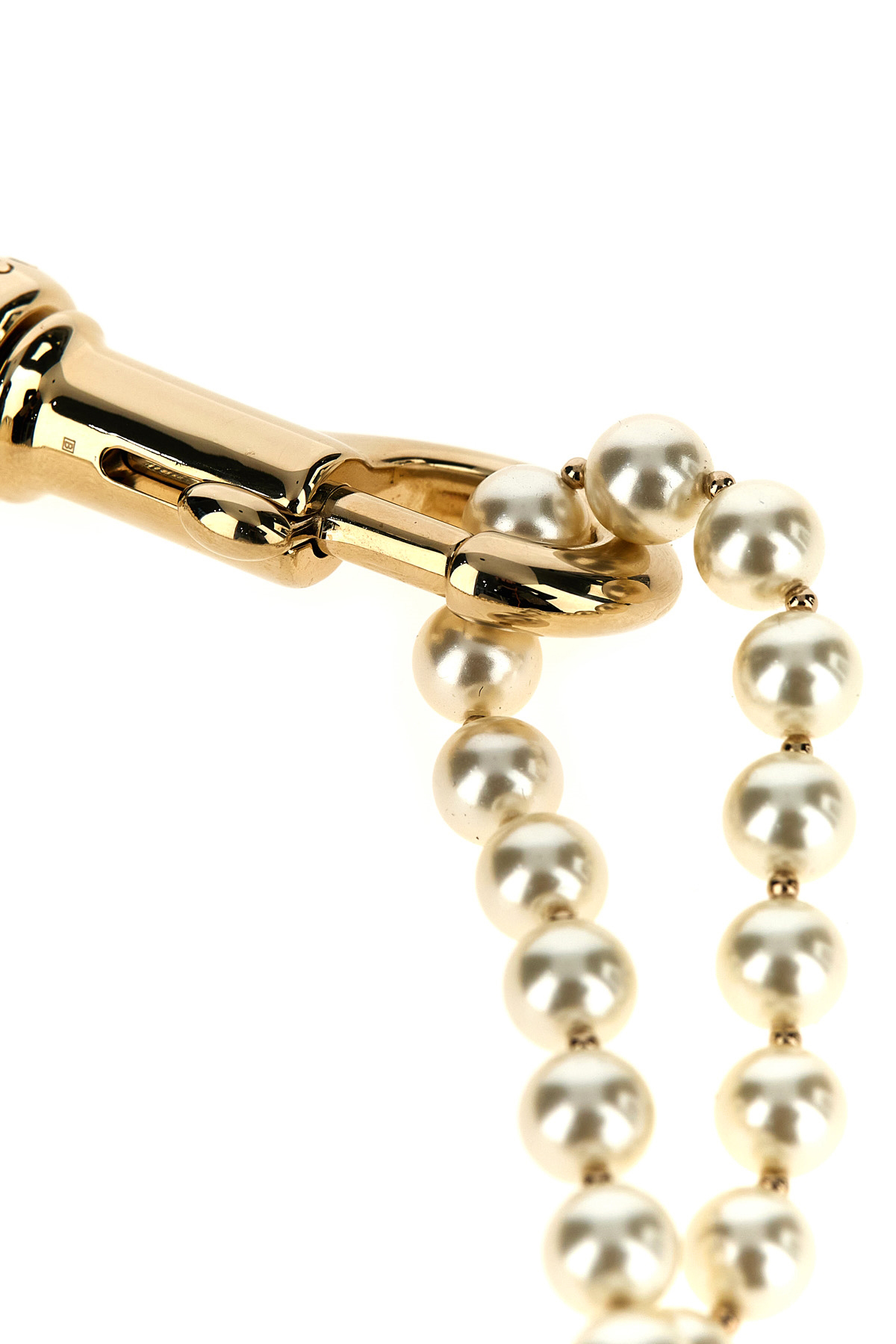 Metal necklace with gold finish and glass beads, snap hook closure with engraved logo.