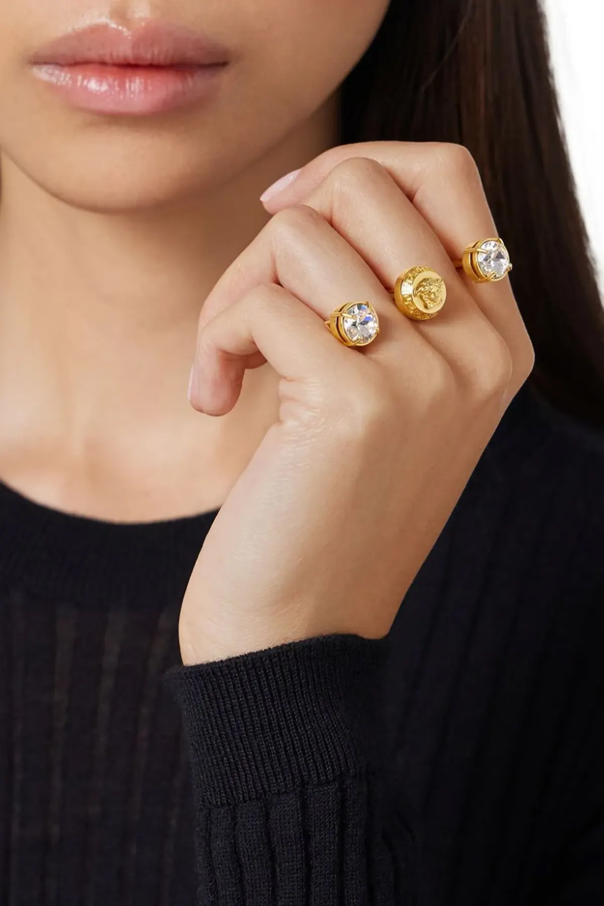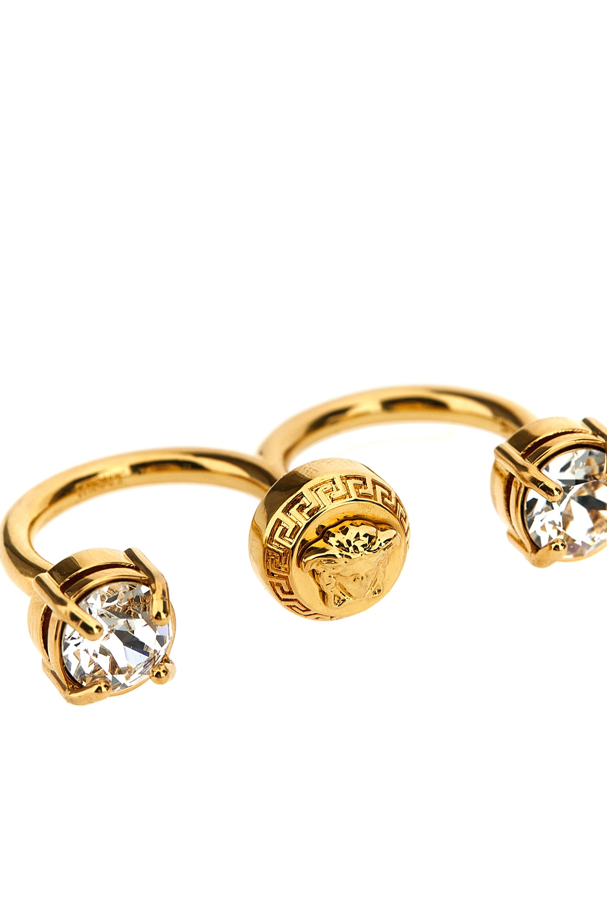 Double 'Medusa' ring in gold metal with crystals.