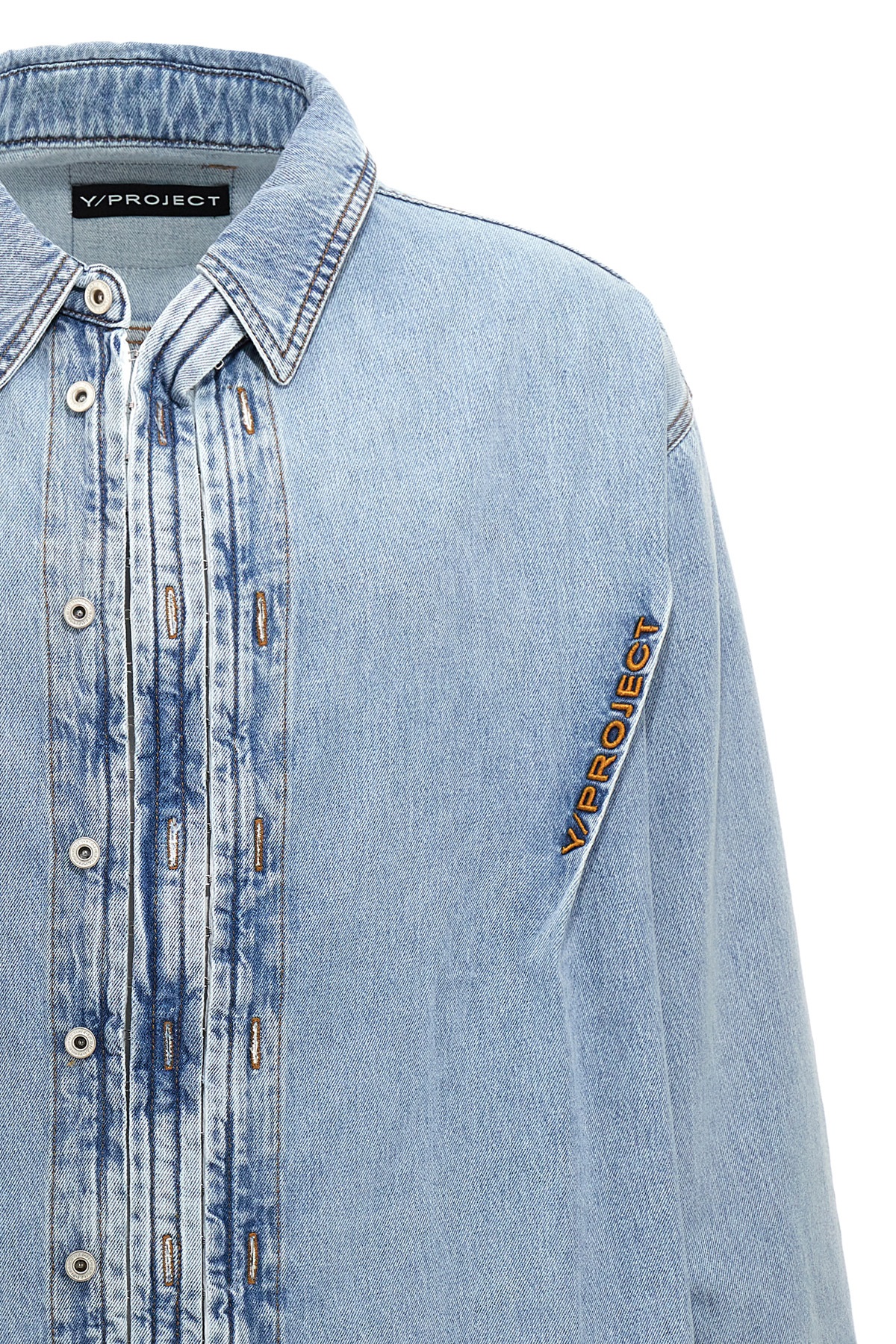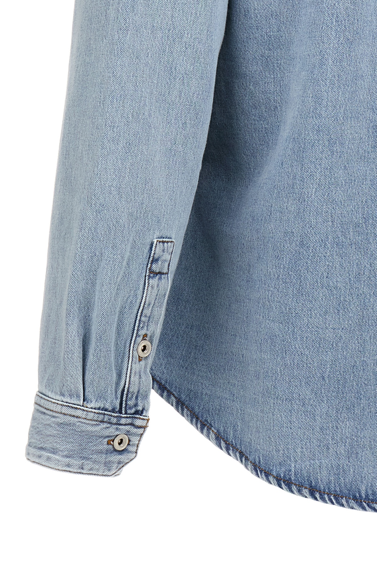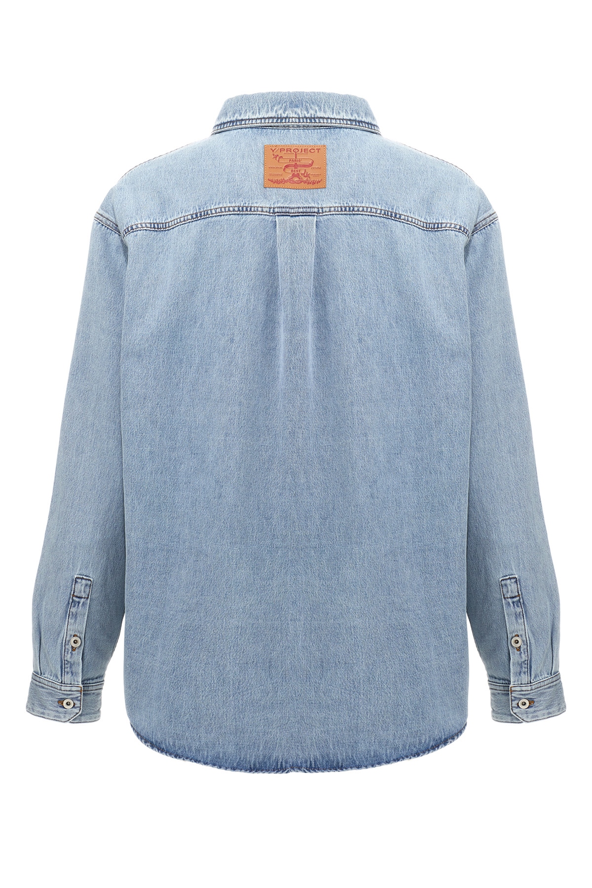 'Hook and Eye' cotton denim shirt with front hook closure, long cuffed sleeves.