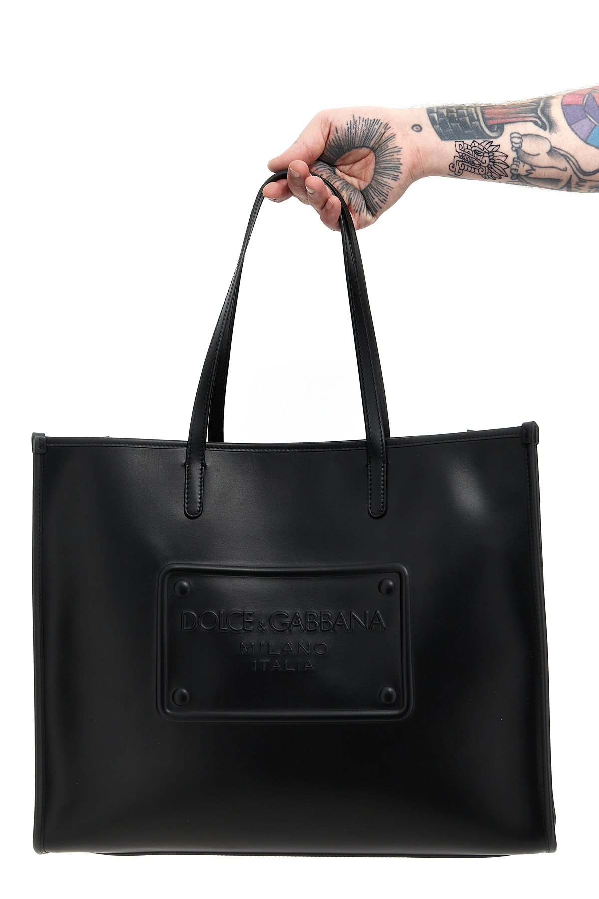 Leather shopping bag with embossed logo, handles, and hidden magnet closure.