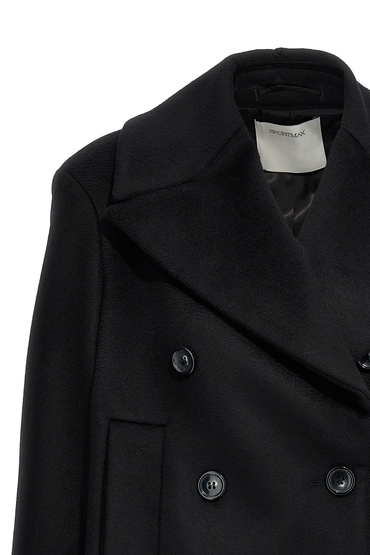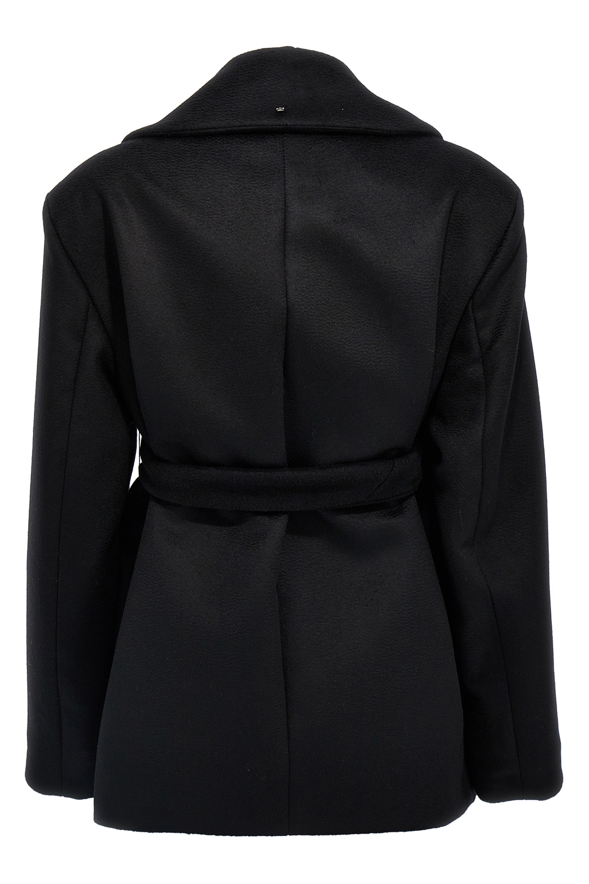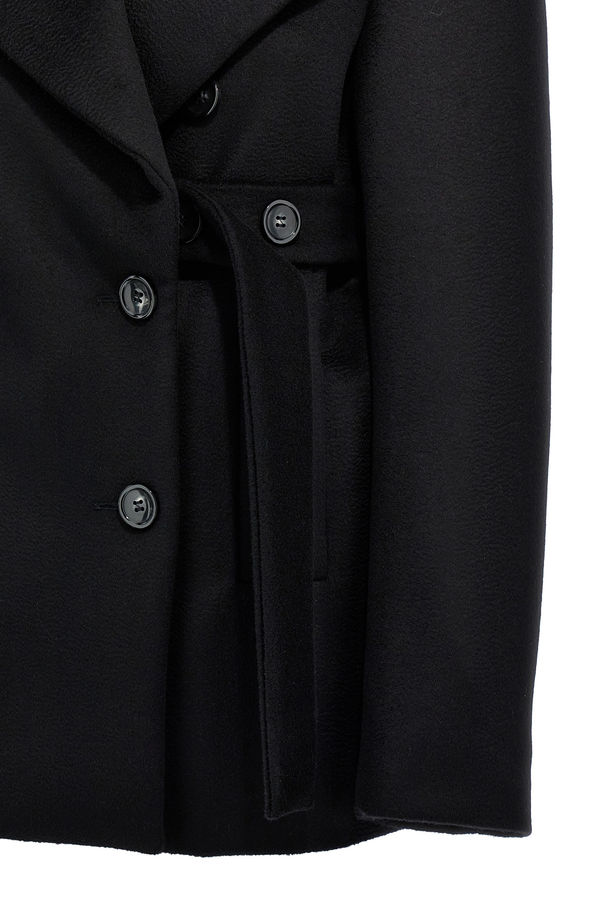 'Orchis' double-breasted wool coat with button closure, mirror lapels, pockets, long sleeves, removable matching belt.