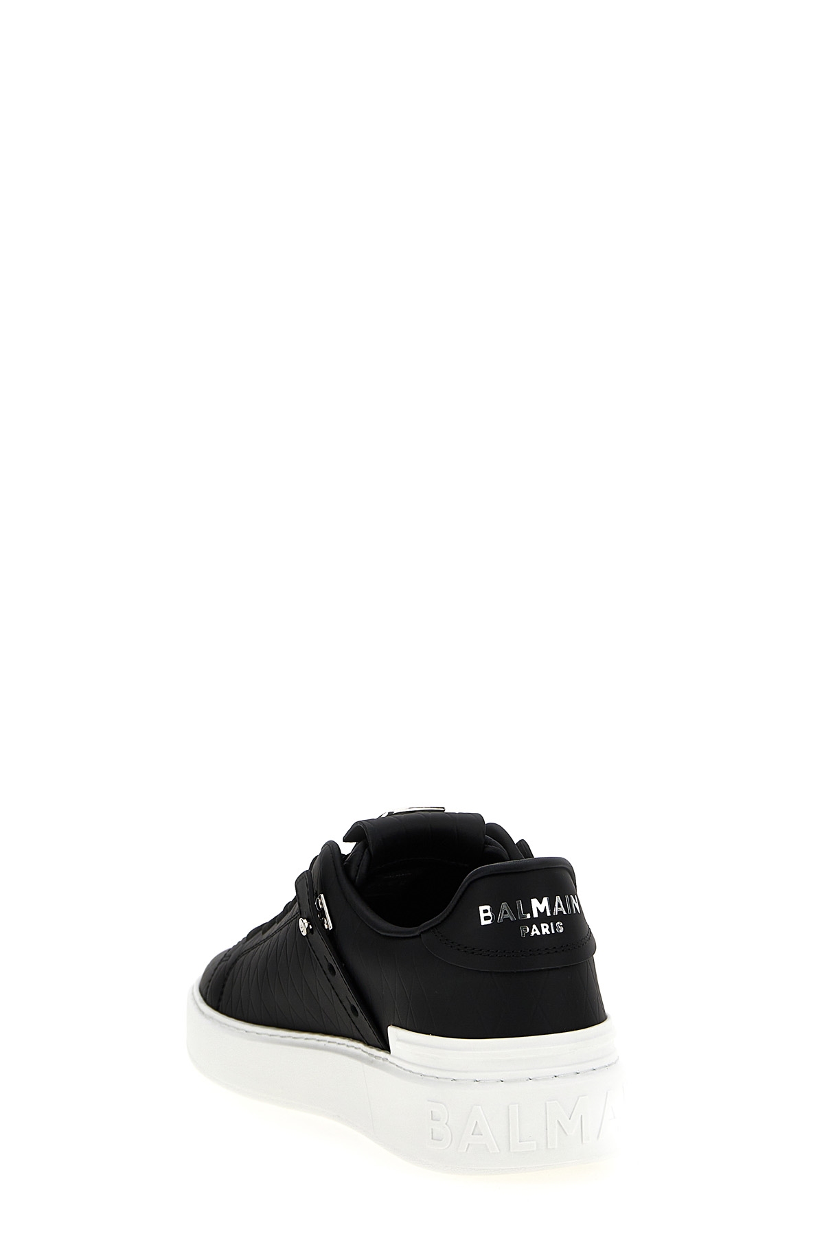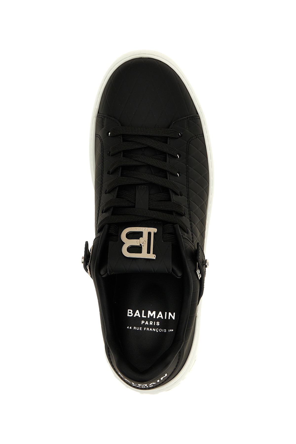 'B-Court B-Buzz' calf leather sneakers with diamond-shaped embossing, metal details, lace-up closure, trompe-l'œthe B-twist quarter-twist front metal clasp, contrast thick rubber sole.