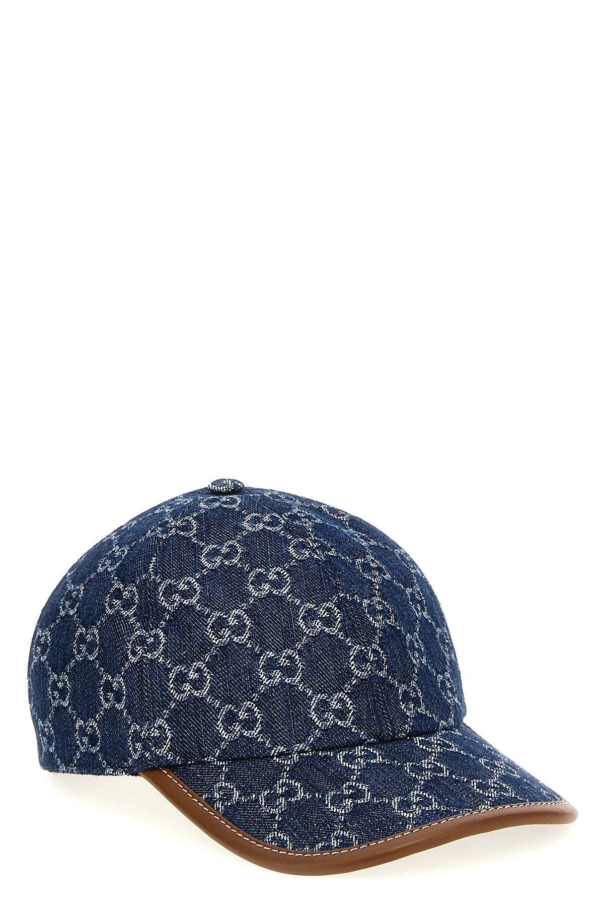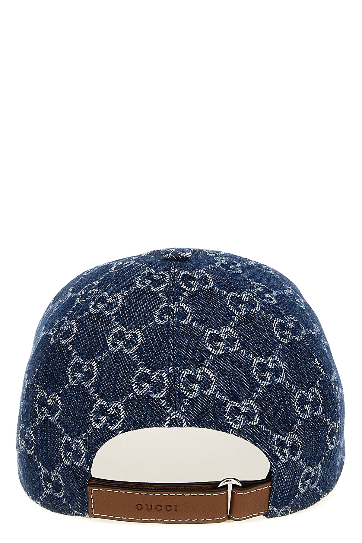 Cotton denim cap with all-over GG monogram, leather details, adjustable back strap.