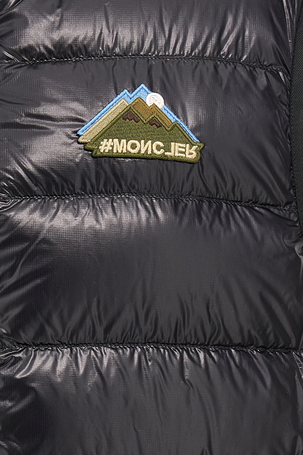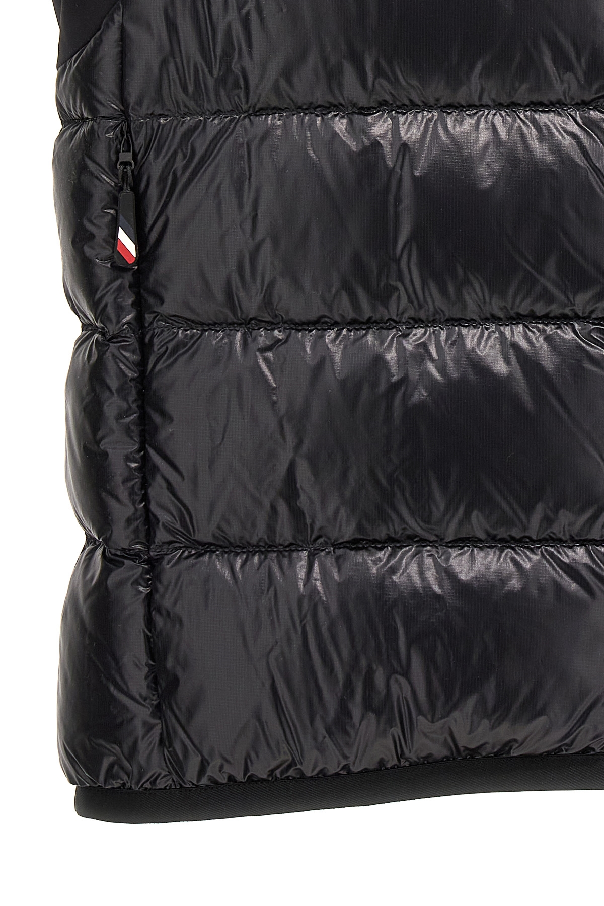 Nylon vest with goose down padding, front logo embroidery, high neck, zip closure, and pockets.