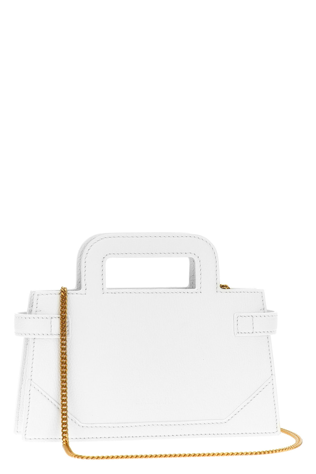 'B-Buzz Small' grainy leather handbag with front vintage metal logo, double fixed handle, chain shoulder strap, vintage metal details, adjustable side straps, magnetic closure.