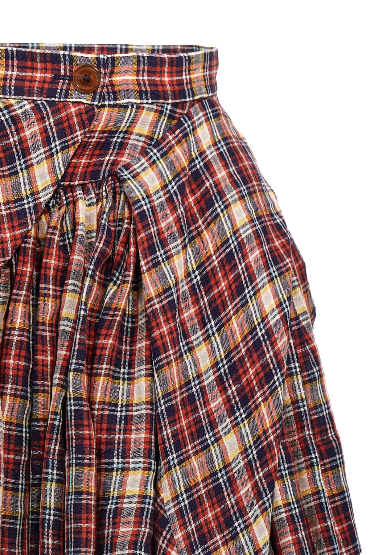 'Nymph' miniskirt in linen blend with picture print with draped details and folded fabric panels, asymmetrical hem, zip and button closure.