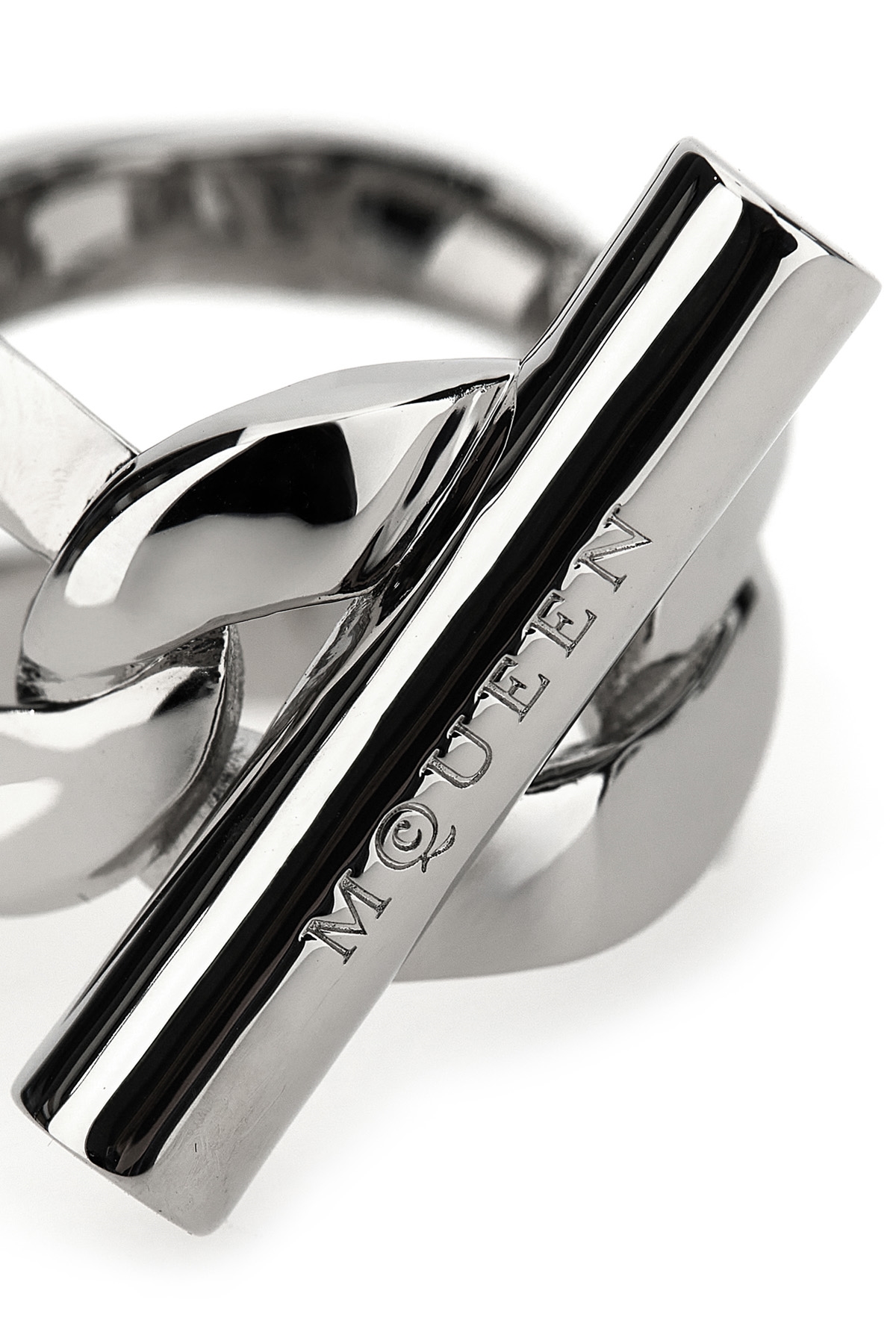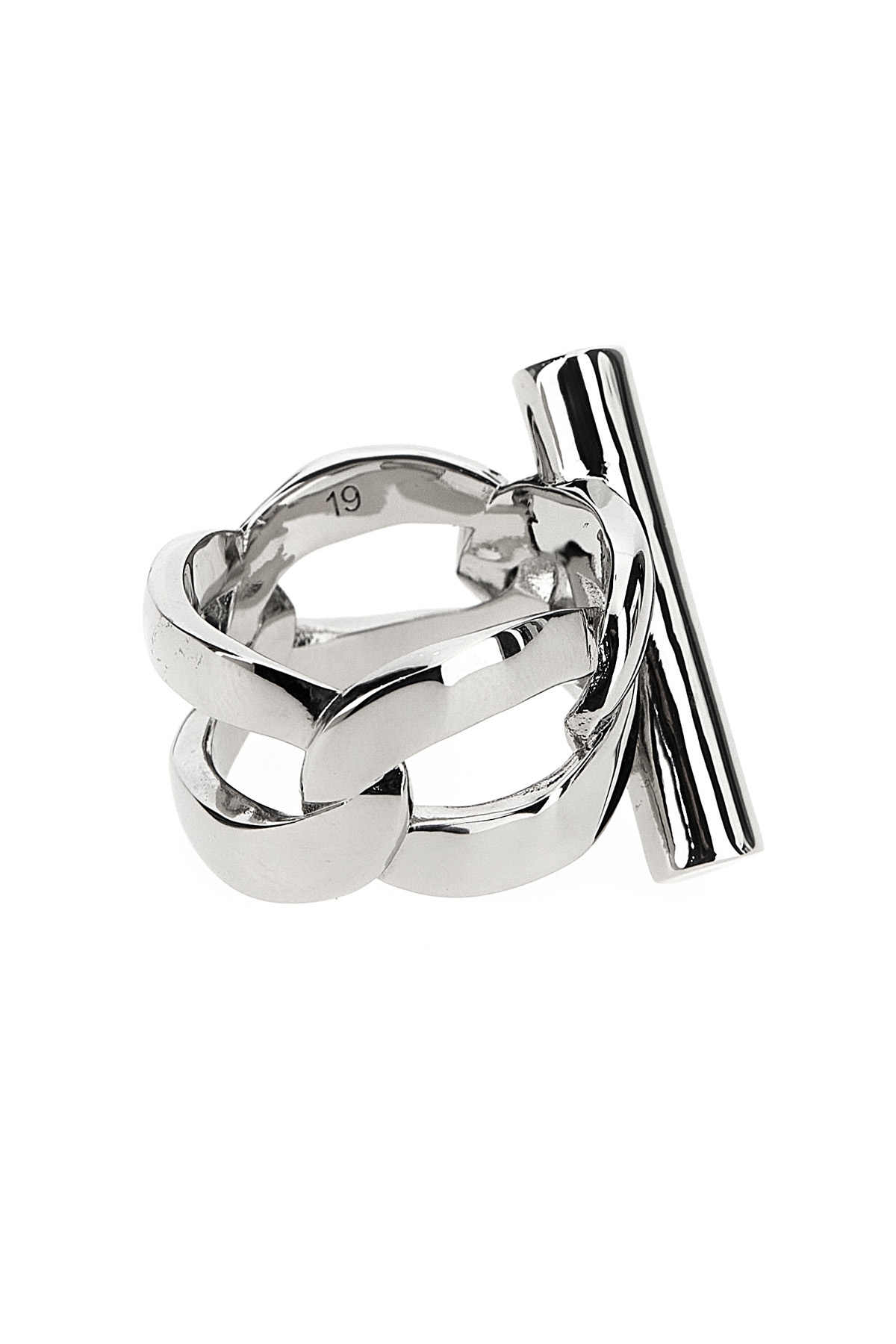 Palladium-finish chain ring with shiny metal T with engraved logo.