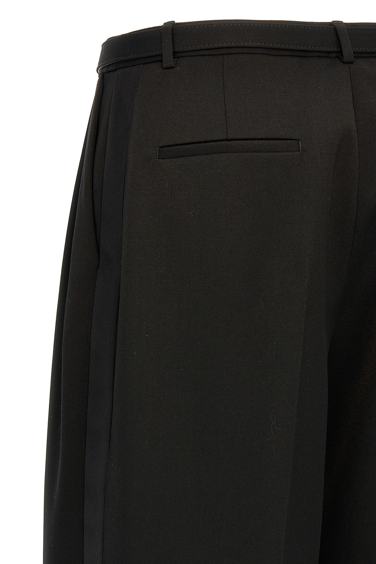 Wool trousers with side satin detail, wide and straight leg, stretched pleat, hook and button zip closure, pockets.