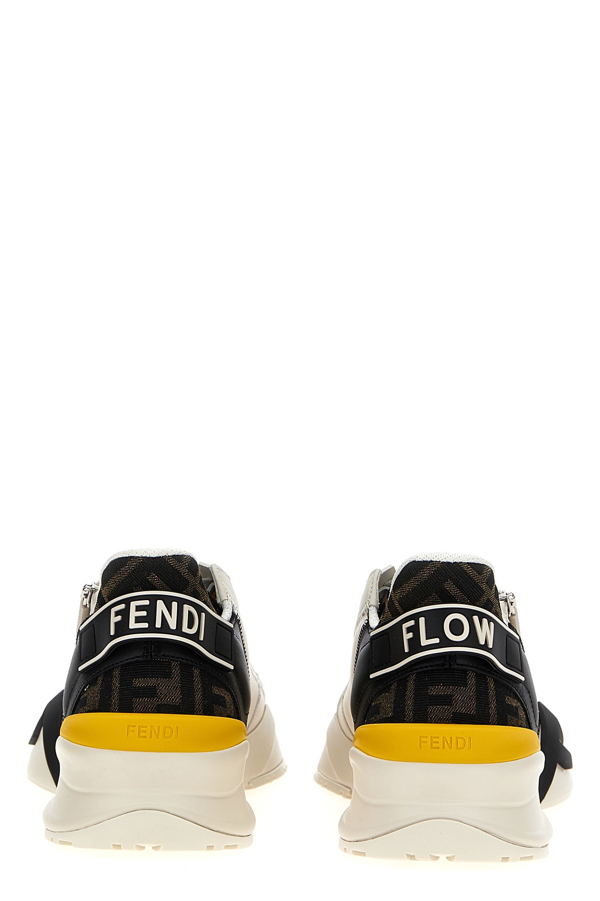 'Flow' leather sneakers with elastic laces, a zip on the side, a notched F-sole, Fendi Flow lettering logo print embossed on the heels, FF jacquard fabric details, Lycra® tongue with FF pattern, white light rubber sole with black diagonal detailing.