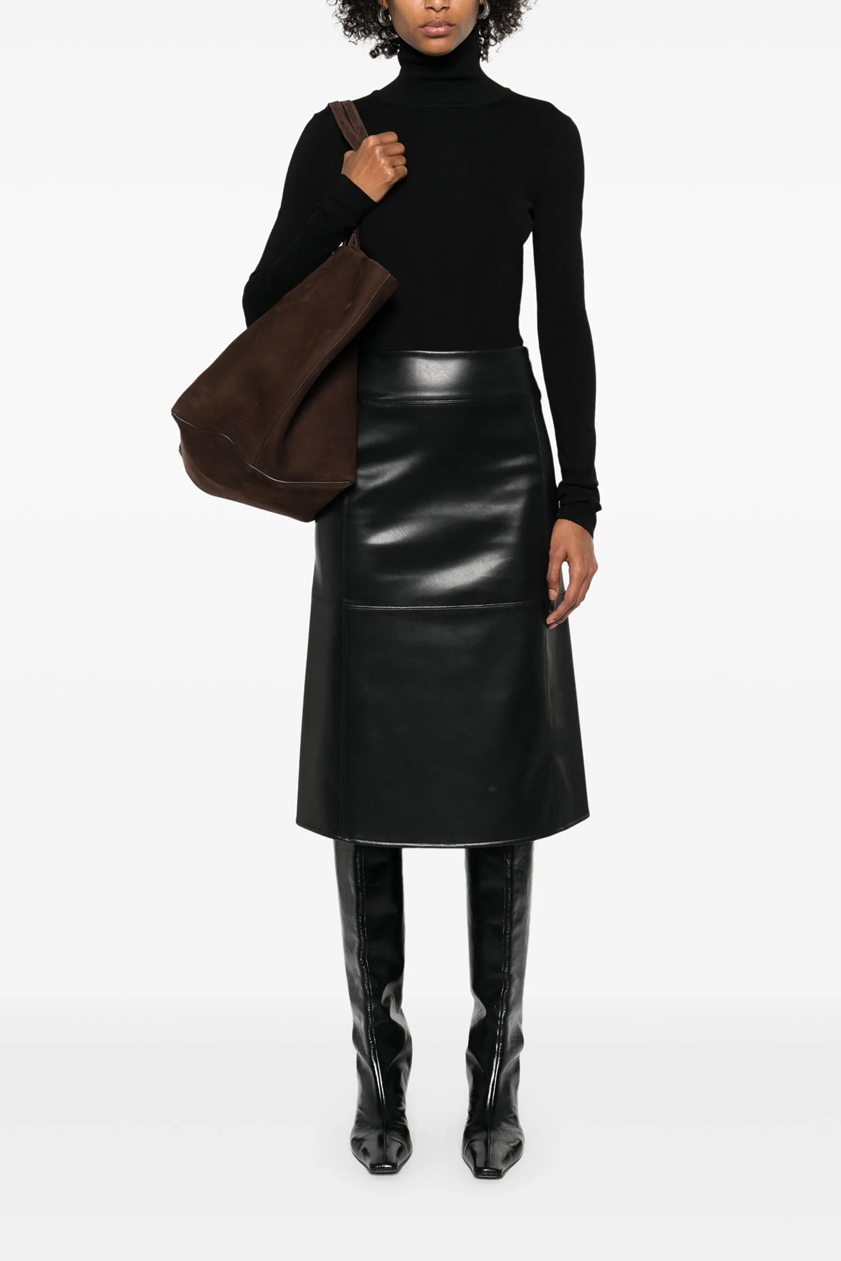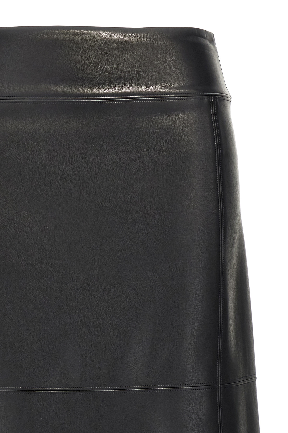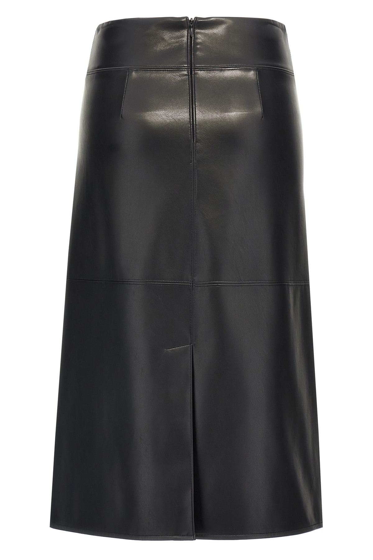 'Volonta' flared midi skirt in eco-leather with stitching detail, back split, back zip and hook closure.
