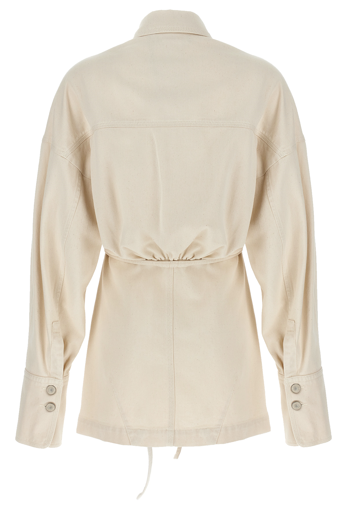 'Biblios' short dress in natural cotton denim with collar, metal button closure, front pockets, adjustable drawstring at the waist, long sleeves with cuffs.