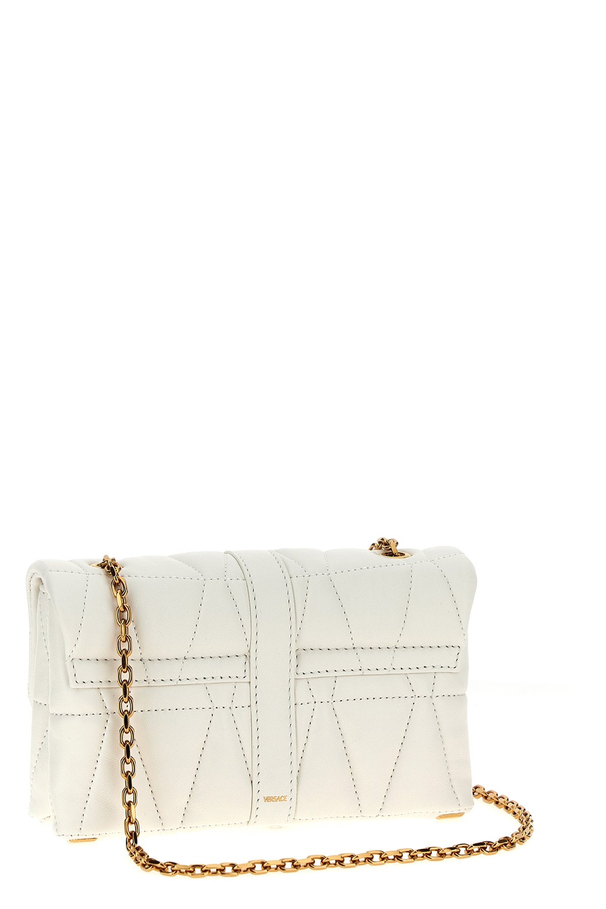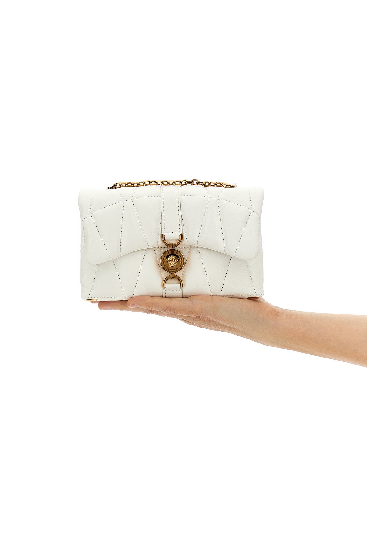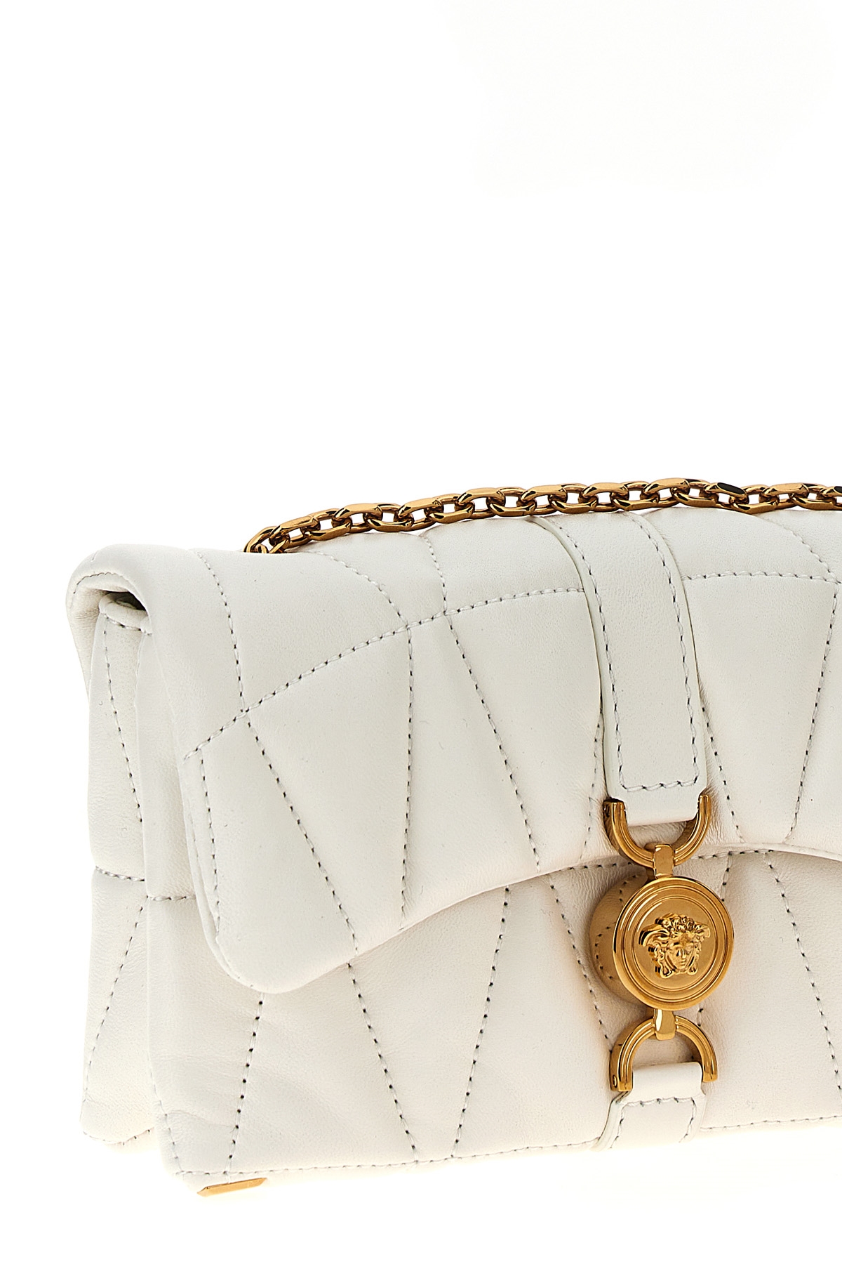 Quilted leather 'Mini Kleio' crossbody bag, metal Medusa closure, chain shoulder strap.