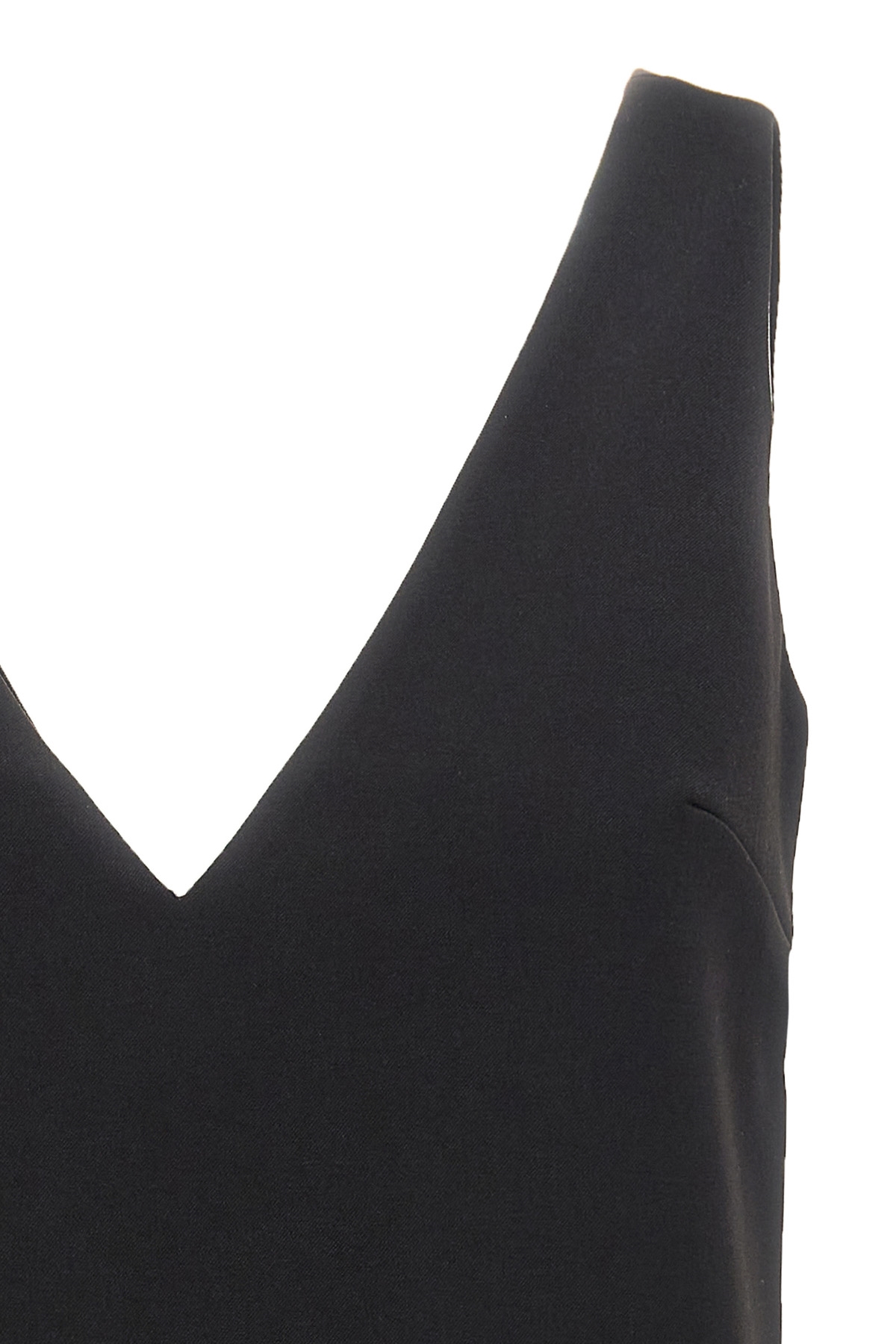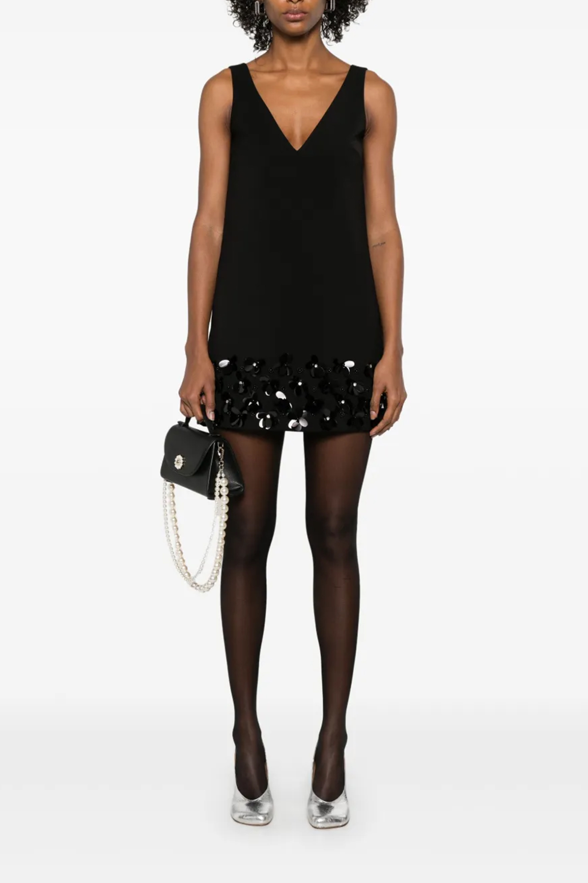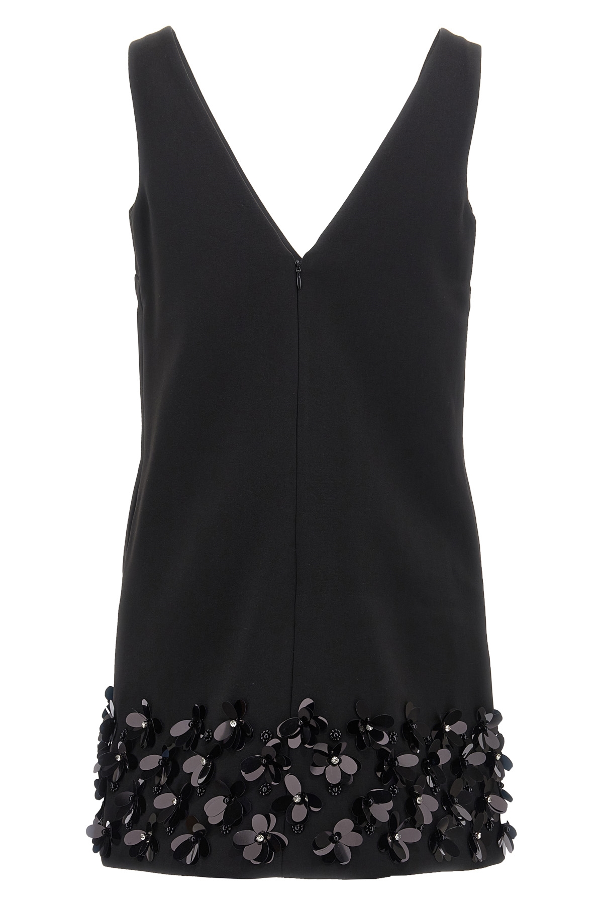 'Black Crepe 3D Sequin Mini' crepe dress with decorations on the bottom of the garment, V-neck front and back, sleeveless, back zip closure.