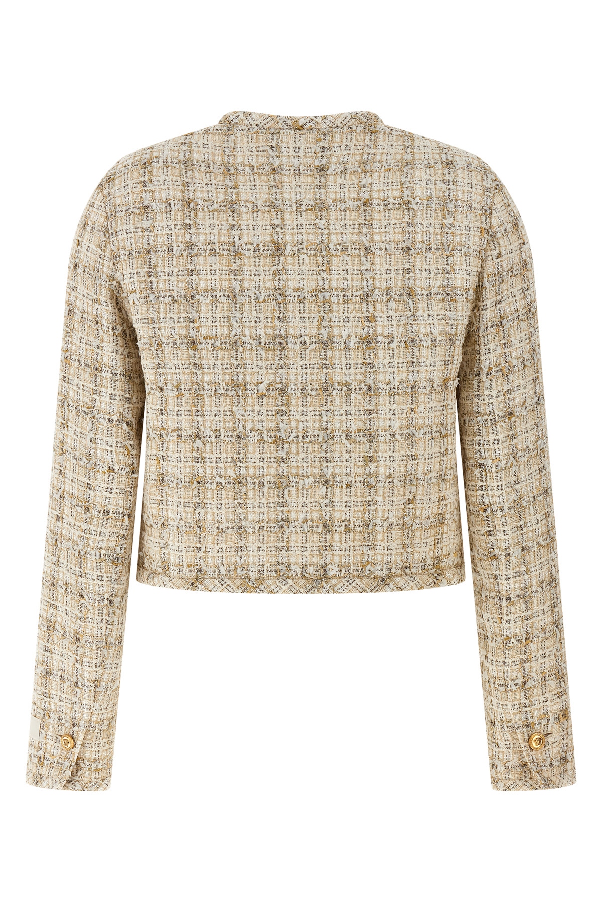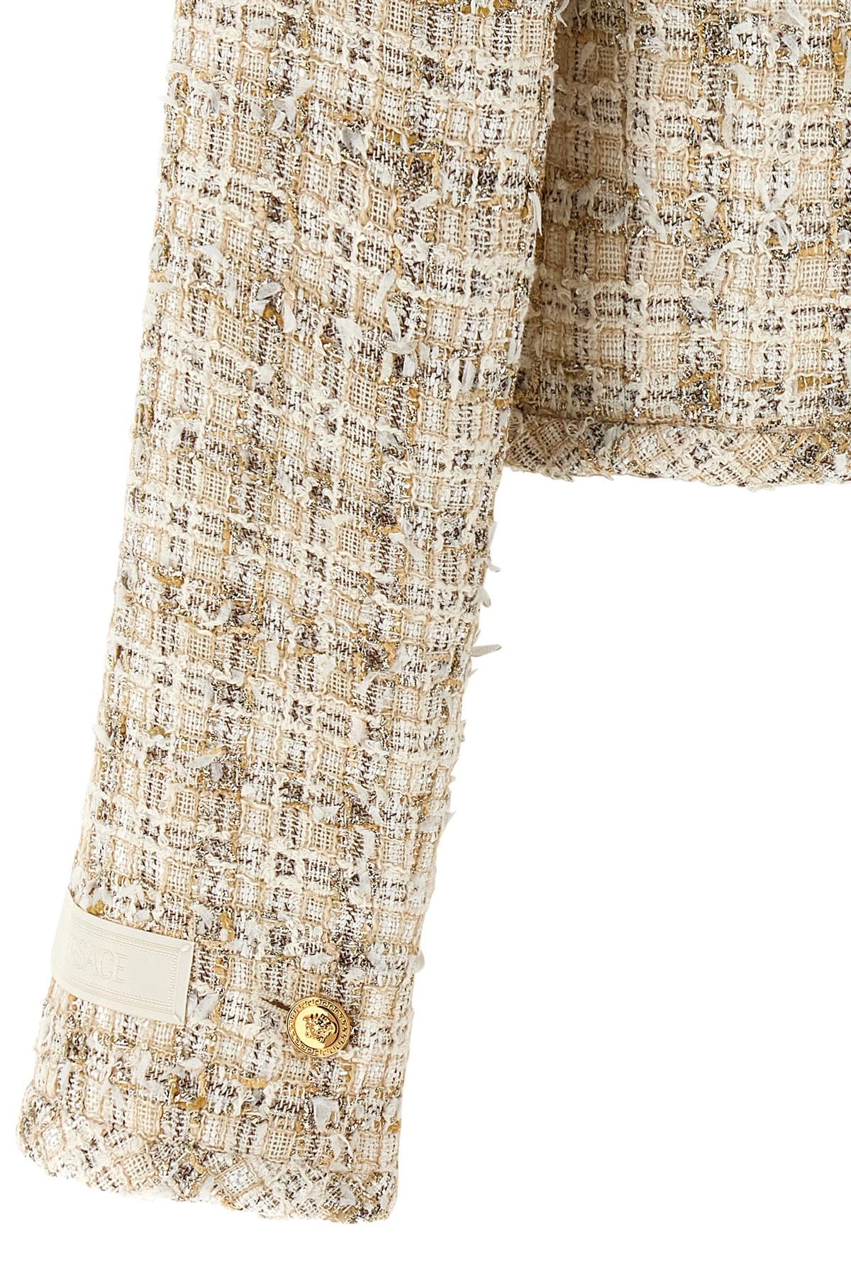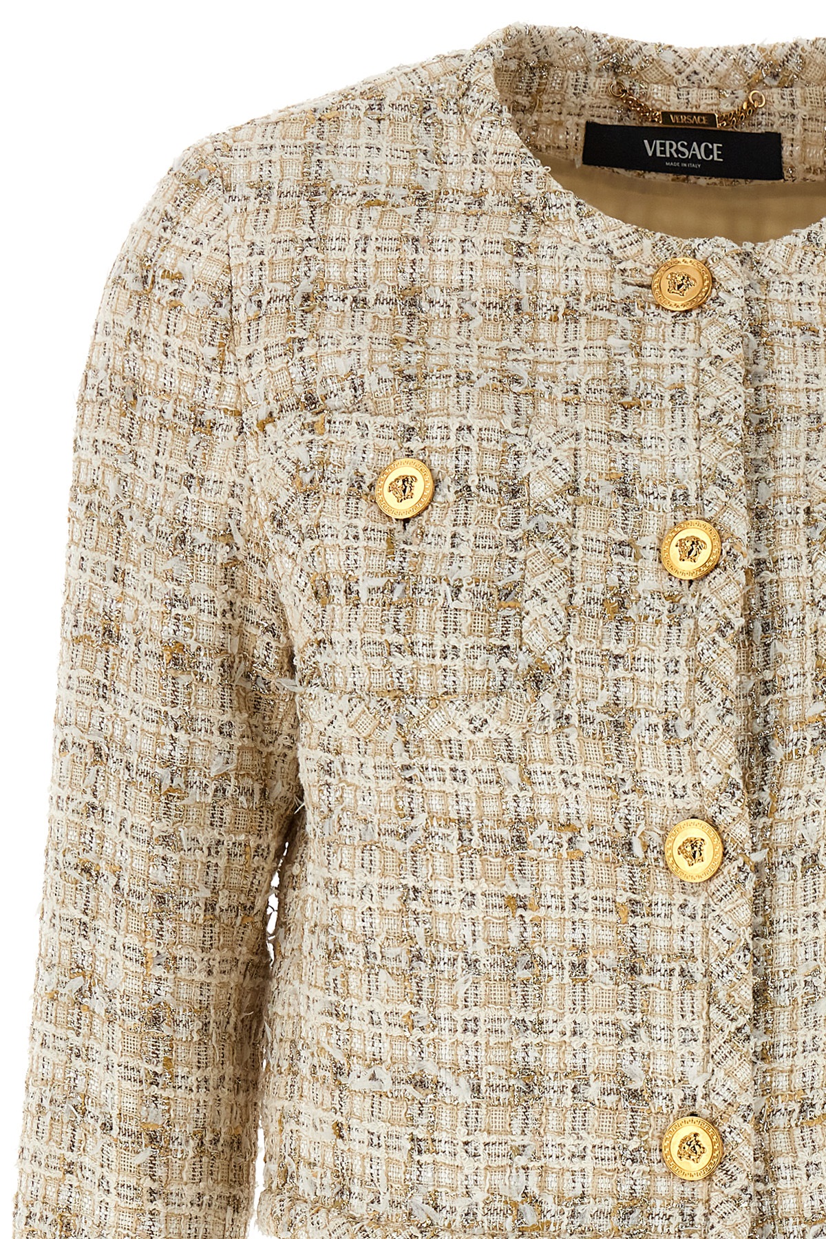 Tweed and lurex blend cardigan, Medusa button closure, crew neck, pockets, long sleeves.