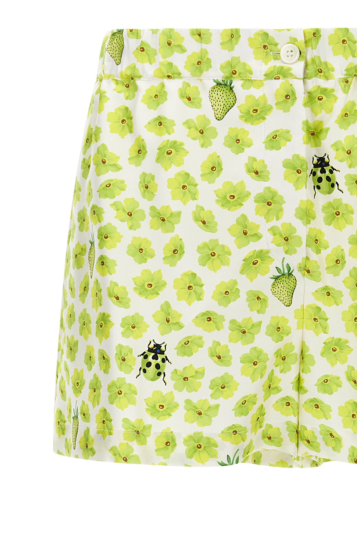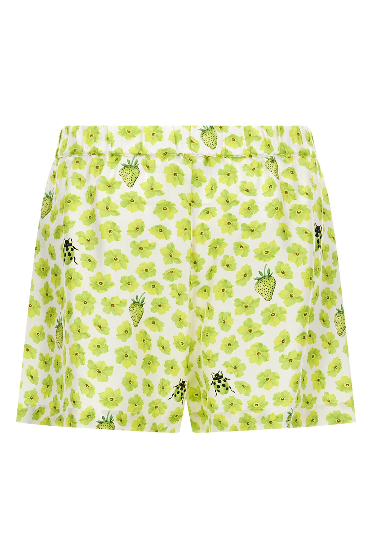 'Strawberry Garden' print silk twill shorts, pajama model, elastic waistband, button flap, pockets.